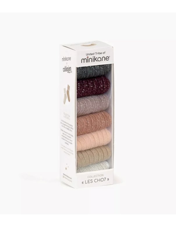 Découvrez le semainier « Les Cho7 » La Couarde-sur-Mer, un lot de 7 paires de chaussettes en coton lurex pour poupées Minikane Gordis 34/37cm, Bambinis 47cm et Babies 28cm.