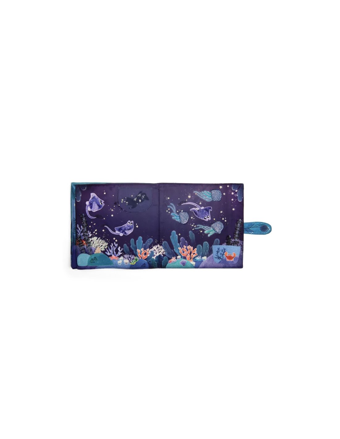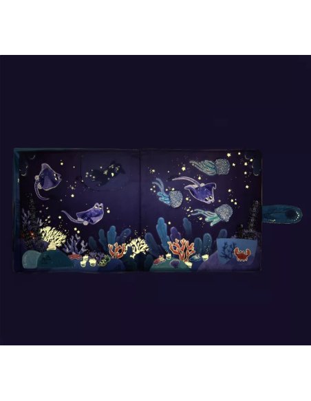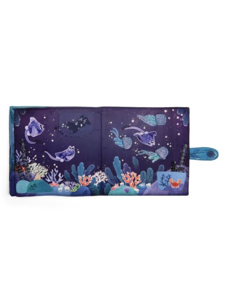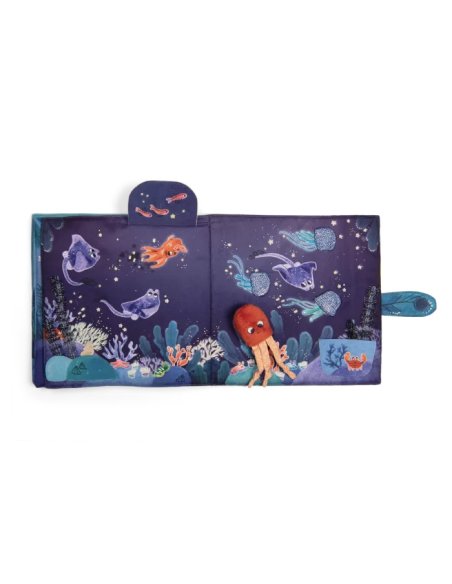 Grand livre en tissu portant sur le thème emblématique des fonds marins. Le hochet poulpe peut se glisser dans une cachette à chacune des 6 pages d'activités sensorielles. Les dernières pages sont phosphorescentes pour illustrer les fonds marins.