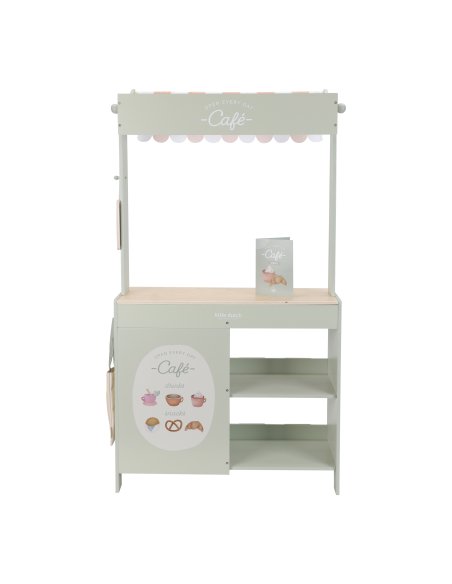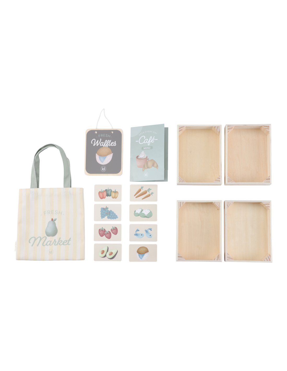 Le marché des petits commerçants ! Avec ce magnifique étal en bois, les enfants peuvent jouer à la marchande dans leur propre petit magasin. L’auvent en tissu crée une atmosphère authentique, tandis que le tableau noir et les cartes illustrées permettent de présenter joliment les produits. L’ensemble comprend également un sac à provisions et des caisses pour une expérience d’achat complète. Retournez l’étal, il se transforme en café avec un menu et des illustrations joyeuses. Pour encore plus de plaisir, combinez-le avec la caisse enregistreuse, la balance ou le présentoir à gâteaux.