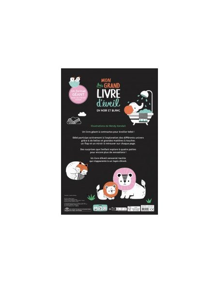4 grandes planches qui mettent en scène des univers constratés adorés des tout-petits :- La maison et les premiers mots du quotidien- Les bébés animaux- Les animaux géants- Au dodo les animaux !On retrouve plus de 20 matières à toucher et un miroir !( de 3 à 5 ans )