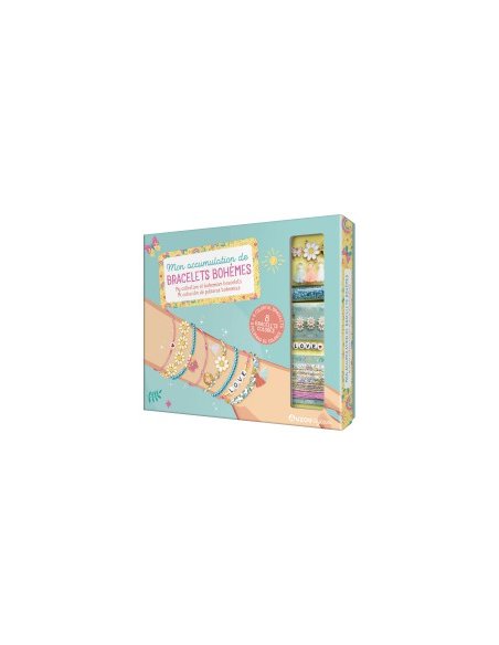Des charms fleur, étoile, papillon, des pompons, du Liberty, des jolies perles de rocailles. Réalise 8 magnifiques bracelets bohèmes aux couleurs douces et fraîches ! ( à partir de 6 ans )