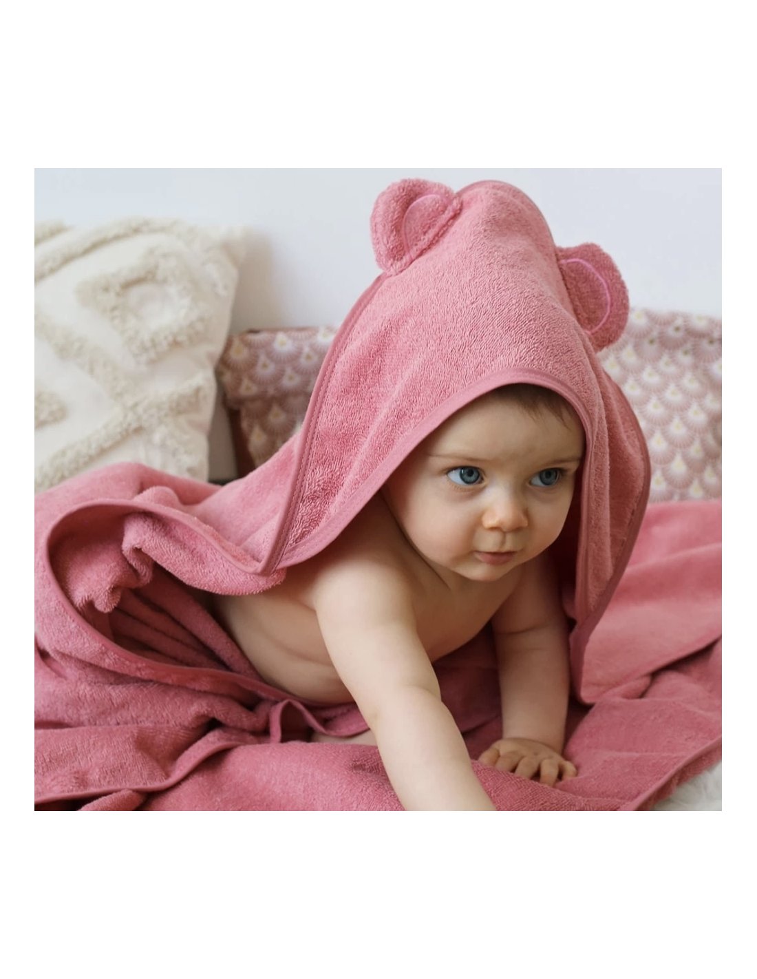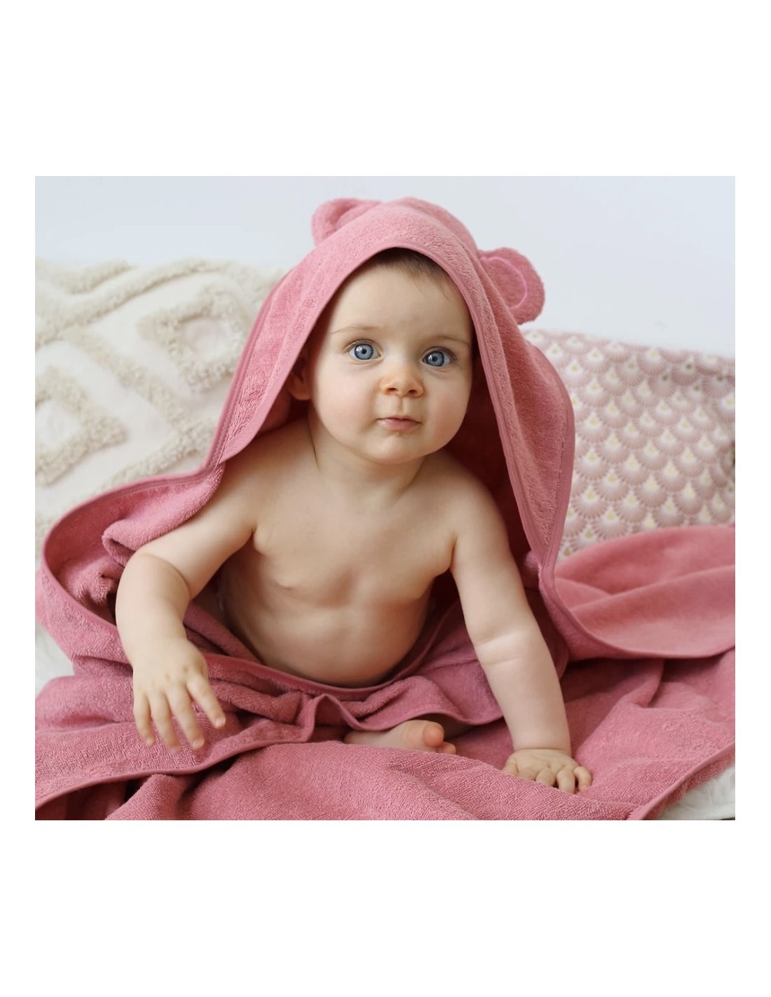 Une belle cape de bain 100x100 cm pour couvrir tout le petit corps de votre mini ! Elle est aussi douce et mignonne que l'ourson aux petites oreilles qu'elle représente !