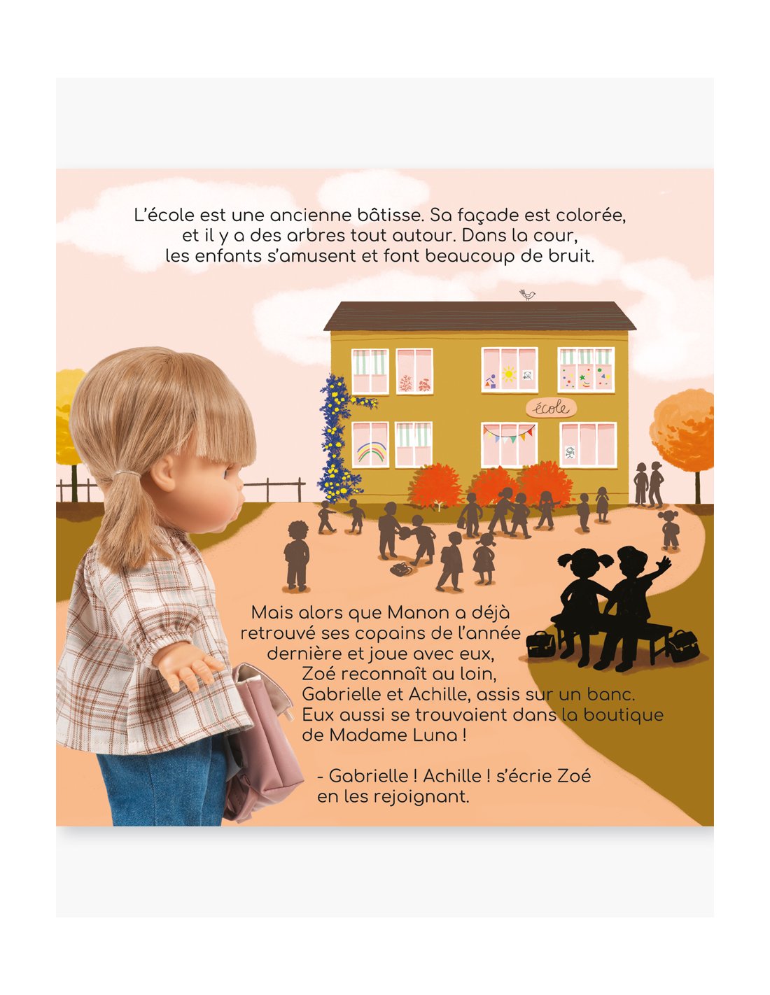 Dans ce premier livre, suivez Zoé pour sa première rentrée en maternelle ! La jeune Manon a craqué pour l’adorable poupée dans la boutique de jouets de Madame Luna. Entre jeux, nouveaux amis et découvertes, Zoé vit une journée inoubliable. Une histoire tendre et joyeuse pour rassurer les petits sur leur propre rentrée !