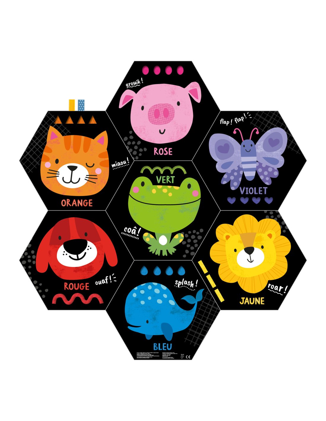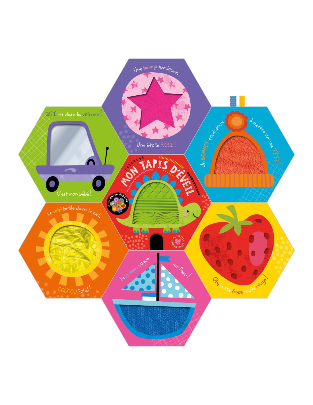 Ce livre se déploie pour former un tapis d’éveil à utiliser recto/verso. Du papier crissant, de la peluche toute douce, de la feutrine, des vaguelettes en silicone, un miroir, des rubans… Les tout-petits vont pouvoir explorer 14 surfaces à toucher et découvrir les couleurs avec des animaux très mignons. Une attache velcro permet de fermer le livre une fois replié.