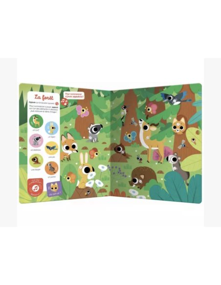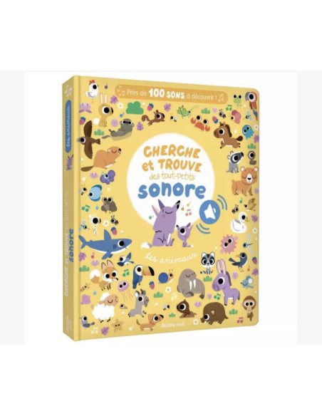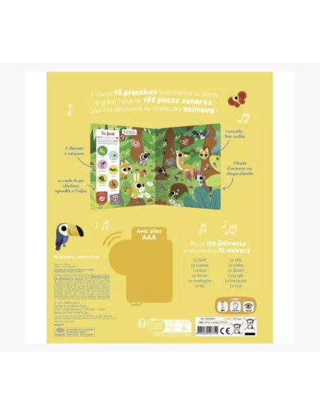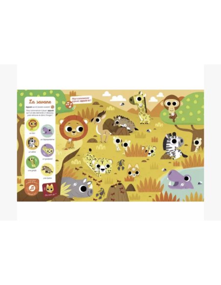 Dans ce nouveau cherche et trouve sonore, le tout-petit explore le monde des animaux à travers 12 planches foisonnantes de détails et près de 100 sons à découvrir ! Sur chaque double-page, il observe et écoute attentivement pour retrouver 6 animaux et une mascotte qui se cache dans tous les univers : la ferme, la forêt, la savane, l'océan, la nuit... Sur chaque planche, un mode de jeu aléatoire est disponible : en appuyant sur la puce, on entend des cris d'animaux à retrouver dans l'illustration (on retrouve les sons de la liste, mais aussi 2 sons mystères en bonus) !