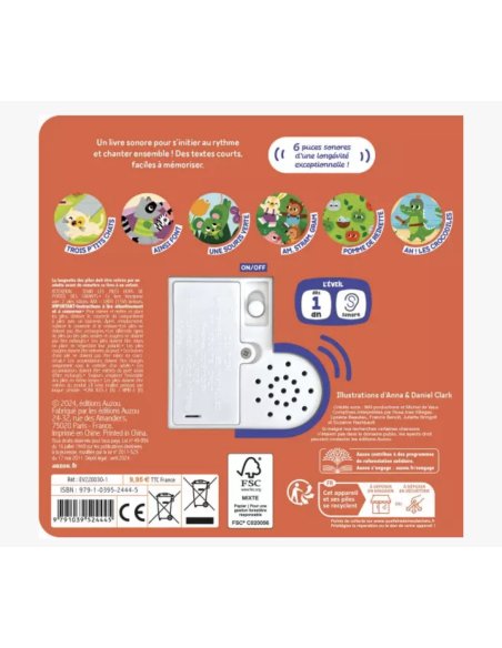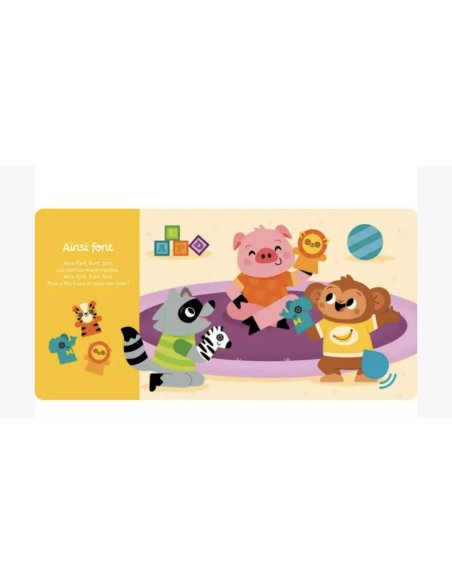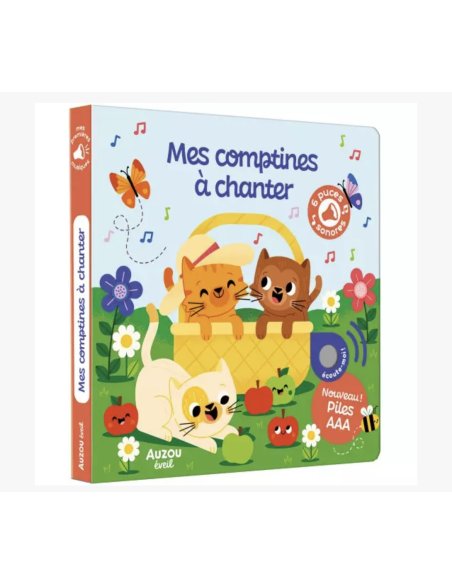 Des comptines courtes, faciles à mémoriser, chantées en crèche et en maternelle. L’ouvrage contient un bouton on/off (pour durer plus longtemps) et des piles AAA (faciles à changer) ! 6 comptines : - Trois p’tits chats - Ainsi font - Une souris verte - Am, stram, gram - Pomme de reinette - Ah ! Les crocodiles