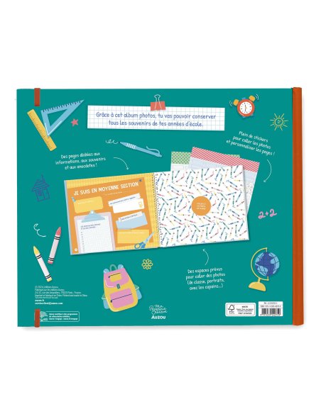 Un magnifique album photo fermé par un élastique pour consigner toutes ses photos de classe ! Des pages sont prévues pour entrer les informations sur chacune des classes, le nom des professeurs, le nom des établissements... L'album comprend également de jolis autocollants pour fixer les photos à l'album.
