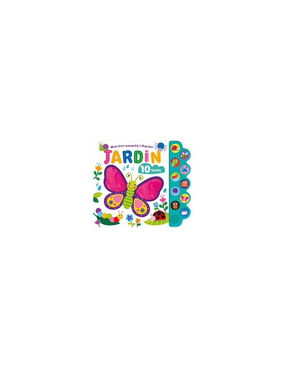 Ce livre invite les jeunes enfants à partir à la découverte du jardin. Ils feront la connaissance d’une coccinelle rouge, d’une abeille jaune, d’une grenouille verte, d’un oiseau bleu… Grâce aux 10 boutons sonores, ils découvriront leurs noms et leurs cris. Les textures à toucher de grande taille feront le bonheur de leurs petits doigts. Un super livre pour éveiller les sens des tout-petits !