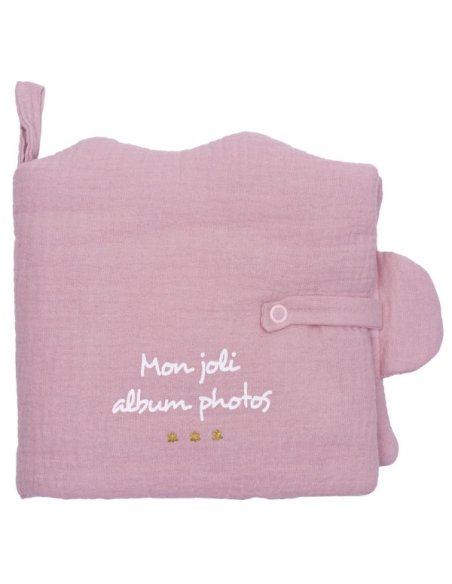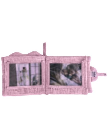Un joli album à feuilleter encore et encore. En double gaze de coton rose pétale délicatement matelassée, il garde précieusement les plus beaux souvenirs de bébé. Sa forme nuage, douce et poétique, invite à la rêverie. À l’intérieur, 3 pages en tissu et 10 pochettes photos (format 10 × 15 cm) accueillent ses plus tendres souvenirs. Grâce à sa boucle, bébé pourra l’emporter partout pour voir et revoir les visages de ceux qu’il aime. La patte à pression garde le tout bien fermé.