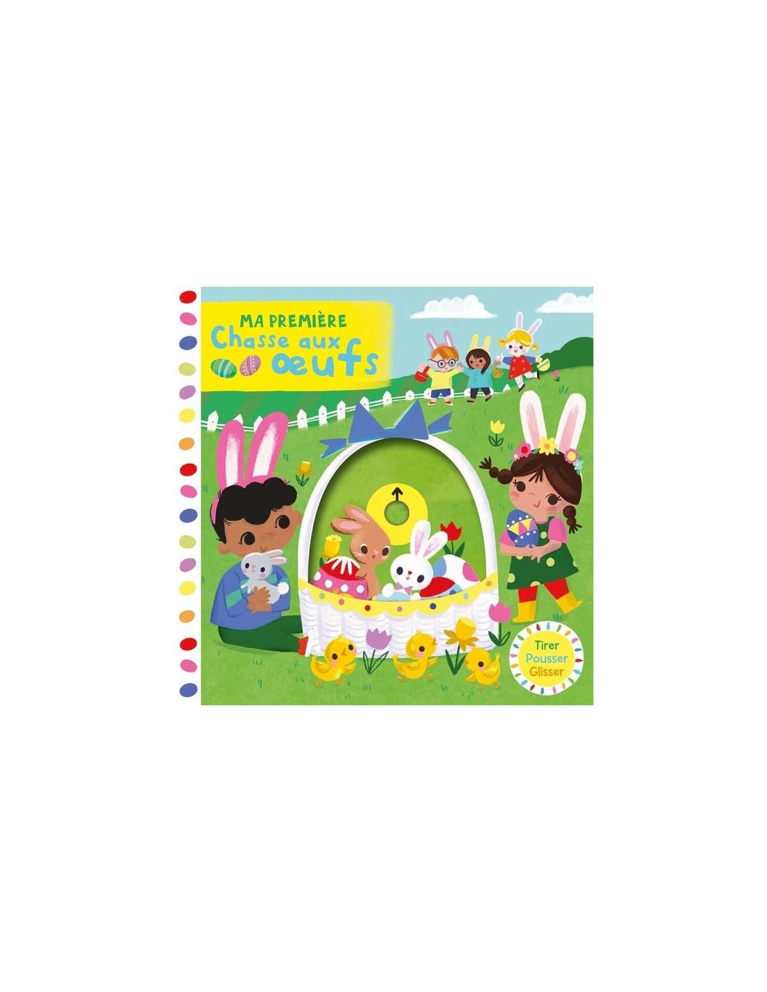 Un livre tout carton avec des tirettes et des roues à tourner pour découvrir Pâques (décorer des oeufs, la chasse aux oeufs, la naissance des poussins, le pique-nique...) et favoriser la dextérité des petites mains. Avec un cherche et trouve sur toutes les pages.
