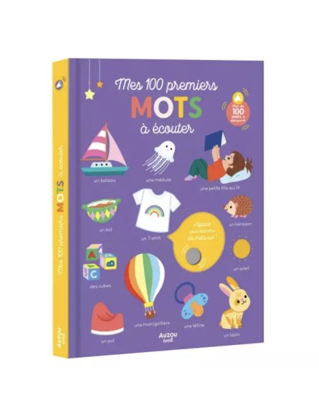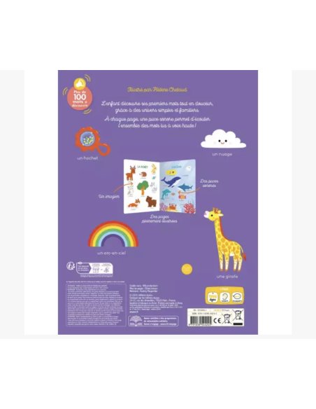 Plus de 100 mots à découvrir avec des puces sonores à chaque page, qui permettent aux petits d'appréhender une nouvelle dimension des objets et mots présentés. Les sons facilitent l'appropriation du nouveau vocabulaire et sa mémorisation. Pointer, nommer, enrichir son vocabulaire et développer son ouïe : un livre d'éveil à manipuler d'abord avec le parent accompagnateur, puis tout seul. Thématiques : - Le corps - Les vêtements - La chambre - La salle de bain - Le salon - La cuisine - La crêche - L'école - La ville - Les transports - Le parc - La ferme - La savane - La banquise - La forêt - l'océan