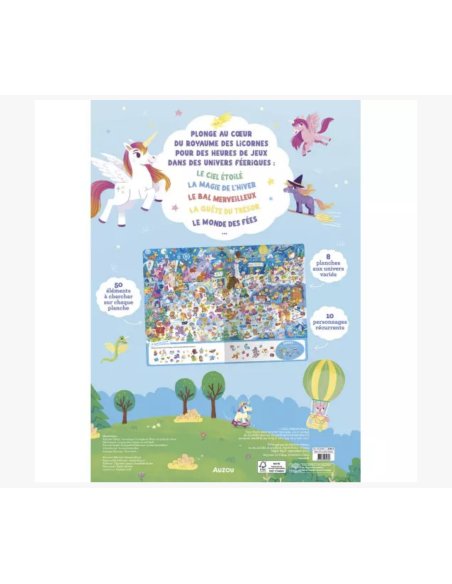 Plonge au cœur du royaume des licornes : pour des heures de jeux dans des univers féeriques : Le ciel étoilé, la magie de l’hiver, le bal merveilleux, la quête du trésor, le monde des fées… Découvre 8 univers colorés et détaillés, avec 50 éléments à retrouver sur chaque page, dont 10 personnages récurrents.