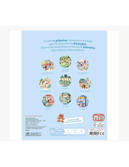 À travers 9 planches de scènes du quotidien foisonnantes de détails, les petits partent à lexploration de leurs émotions. Ils observent attentivement et retrouvent 7 éléments (+ la mascotte) bien cachés sur chaque planche.