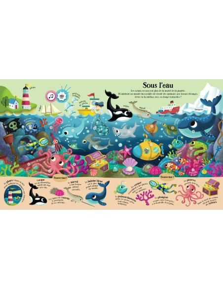 Ce livre sonore est extraordinaire ! Ses 200 puces sonores invitent les jeunes enfants à découvrir autant de mots et les bruits associés. Plonger dans l’océan et découvrir le cri du dauphin, observer le monde souterrain, pénétrer dans la jungle et écouter le lynx miauler, explorer la campagne et faire connaissance avec les animaux de la ferme, découvrir les saisons…