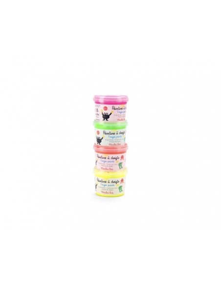 4 pots de peinture à doigts fluo pour laisser libre court à la créativité des petits ! Plongez le doigt dans la peinture, déposez la couleur sur une feuille et commencez à créer votre œuvre. Gouache lavable à l'eau. Testé dermatologiquement. 2 ans et