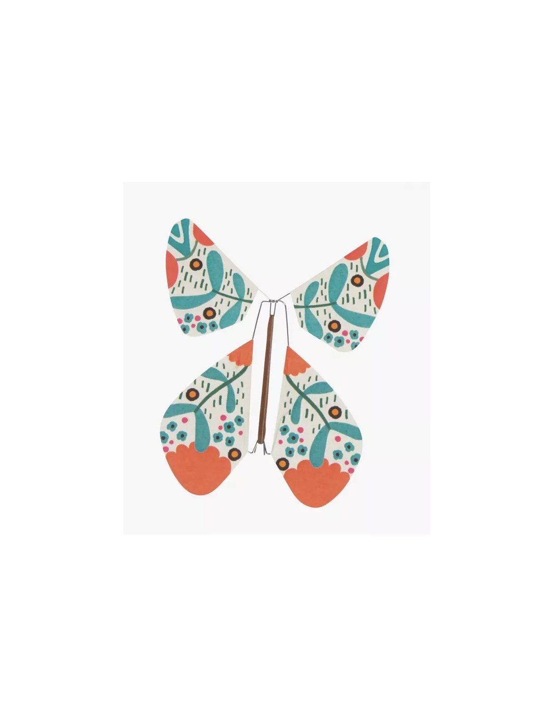 Pour un tendre message plein de poésie : tournez plusieurs fois les ailes de ce joli papillon aux impressions fleuries orangées et bleues, glissez le dans un livre ou une carte et surprise, à l'ouverture, le papillon s'envole.