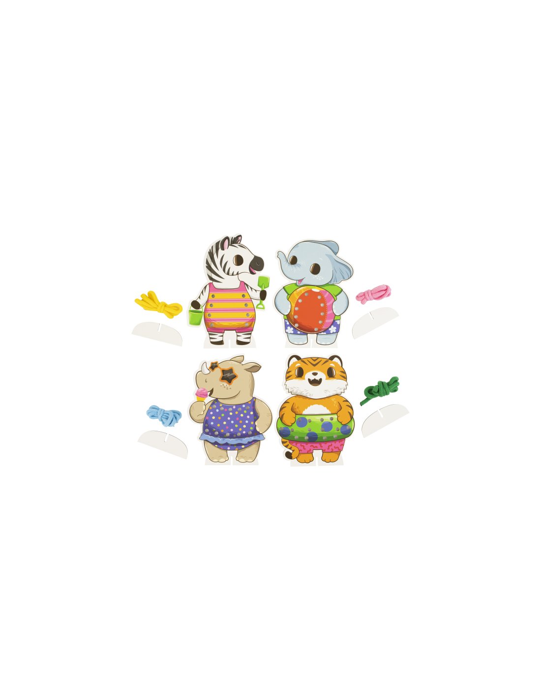 • Chaque ensemble comprend 4 cartes de laçage de personnages animaux, 4 supports en carton, 4 lacets colorés (70 cm de long)