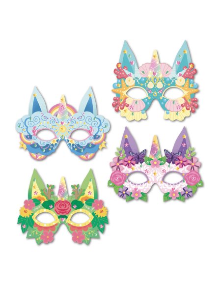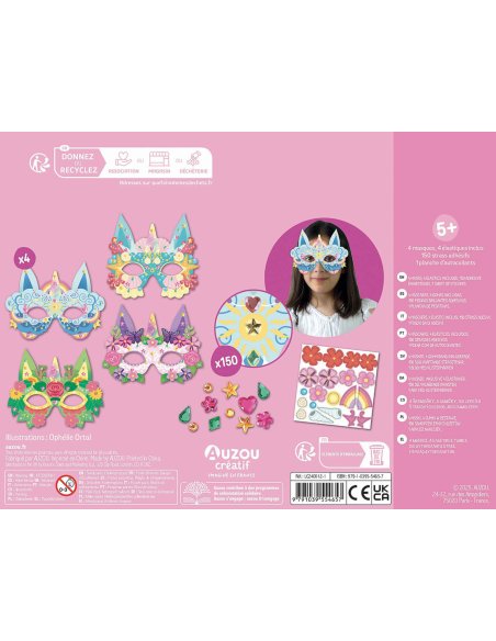 Découvre dans cette magnifique pochette 4 superbes masques de licornes à décorer avec 150 strass brillants. Licorne céleste, licorne de la forêt, laquelle incarneras-tu pour le carnaval ?