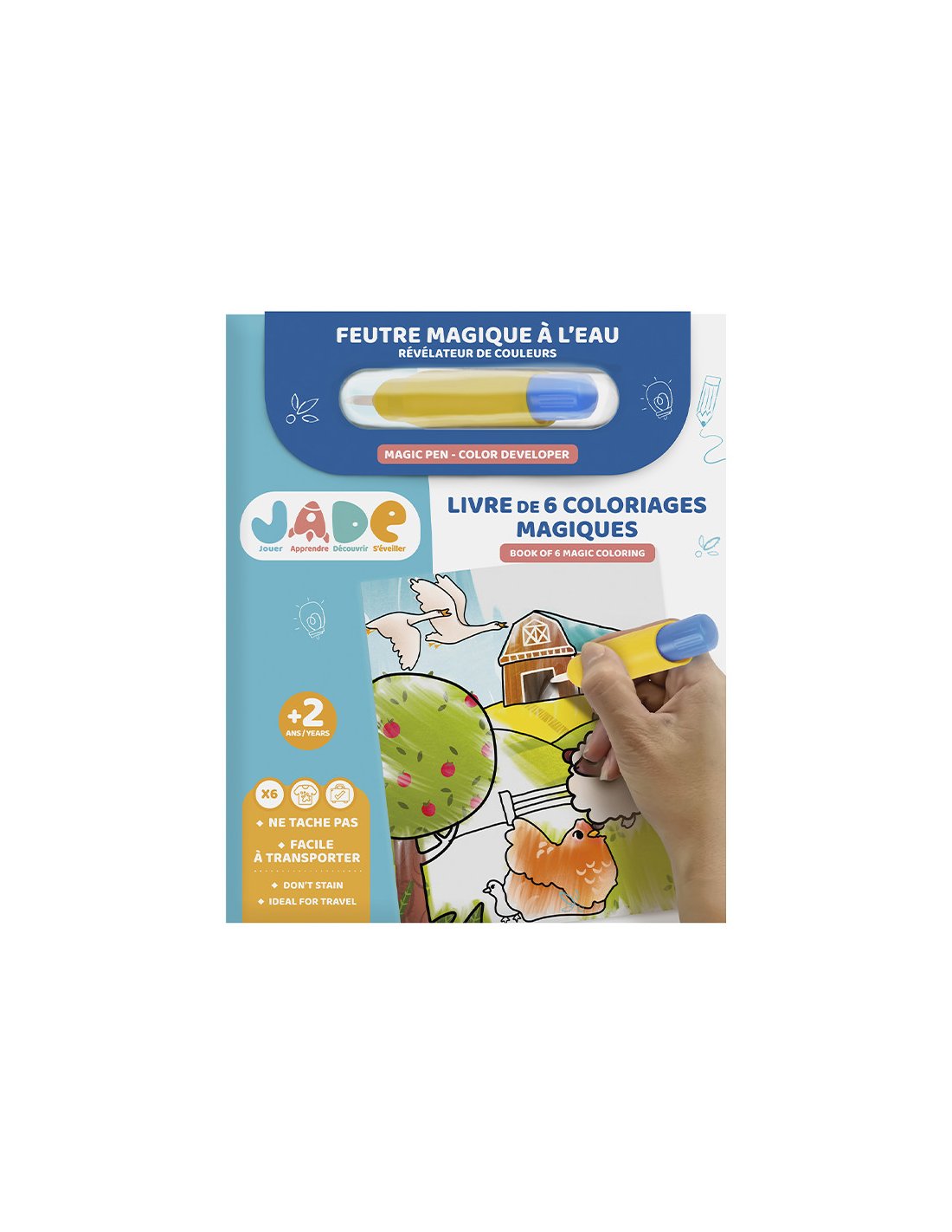 Ce livre de coloriages JADE est vendu avec son feutre doté d'un réservoir à l'eau pour révéler les couleurs. Il s'agit donc de coloriages qui ne tâchent pas, dans un format facile à transporter !