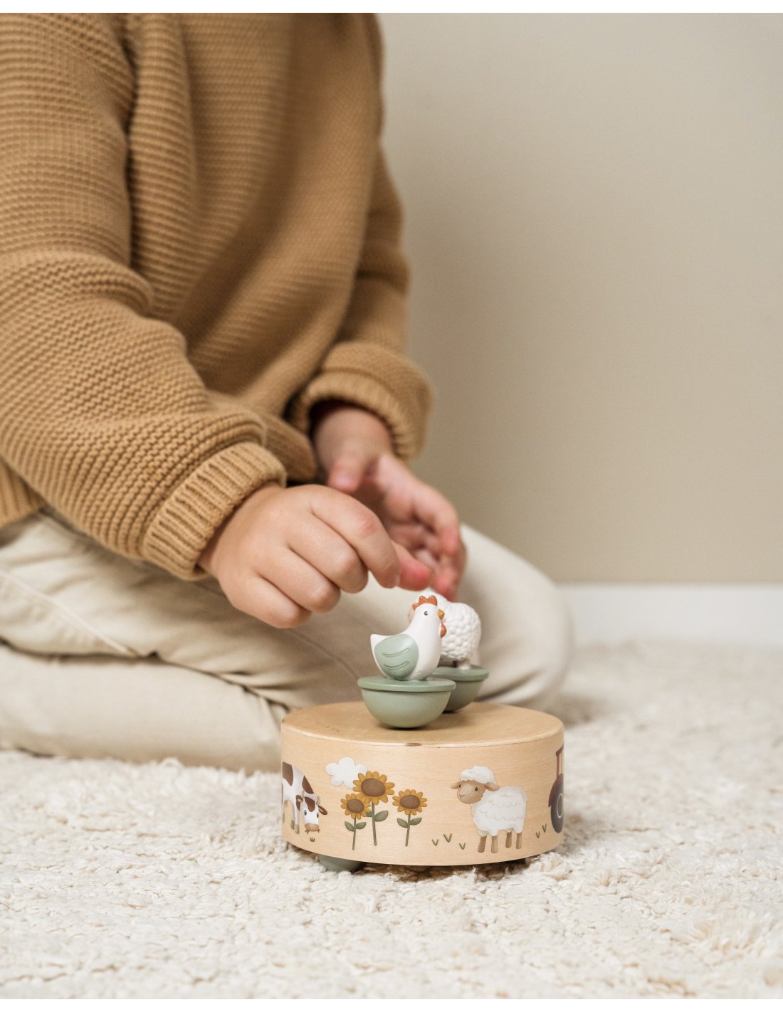 Regarde la poule et le mouton se trémousser sur la joyeuse musique ! Cette boîte à musique ronde est décorée d'une joyeuse scène de l'adorable thème Little Farm. Tourne délicatement en dessous pour lancer la danse magique. Lorsque la mélodie commence à résonner, le mouton et la poule dansent avec grâce sur les célèbres notes de « Old MacDonald Had a Farm ». Un magnifique cadeau qui fera sourire votre enfant dès les premières notes du voyage musical de Little Farm.