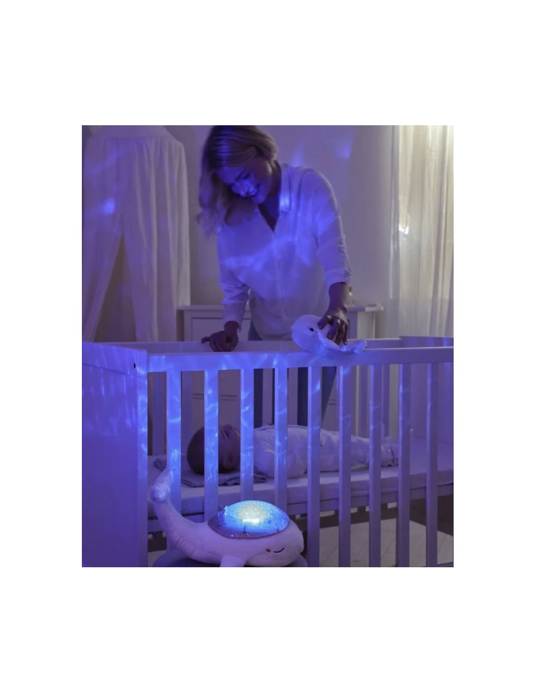 Tranquil Whale™ Family - Blanche - Baleine veilleuse musicale et son baleineau en peluche. Elle diffuse une douce lumière et projette sur le plafond de la chambre les vagues de l’océan en mouvement.