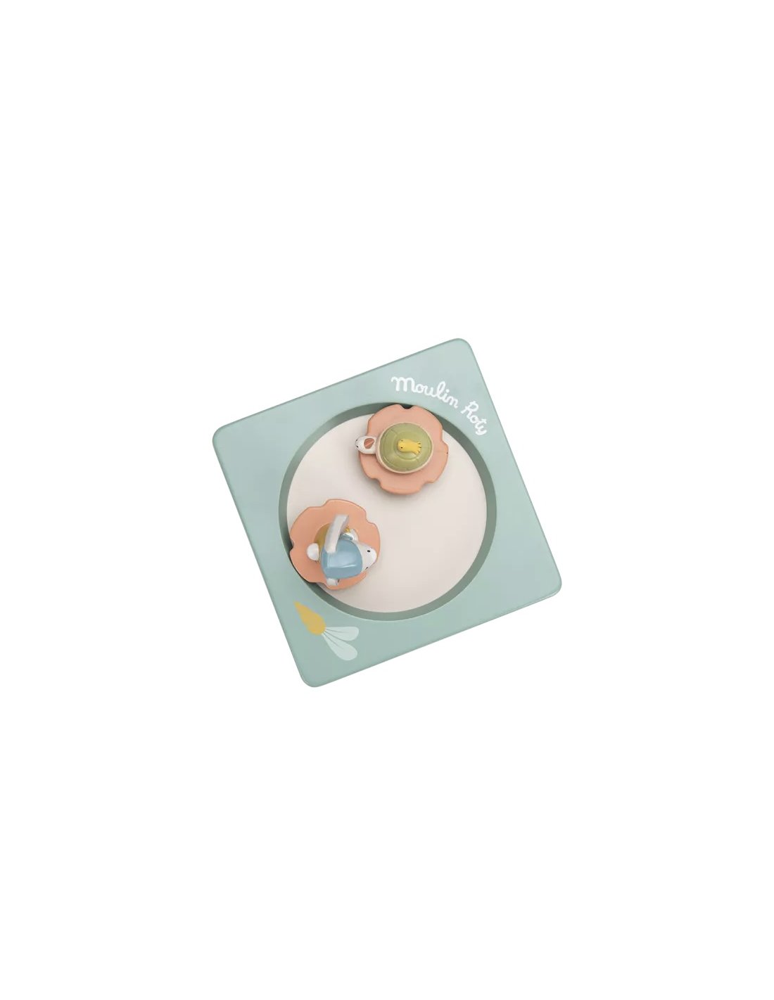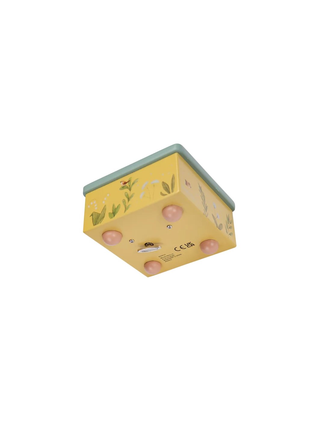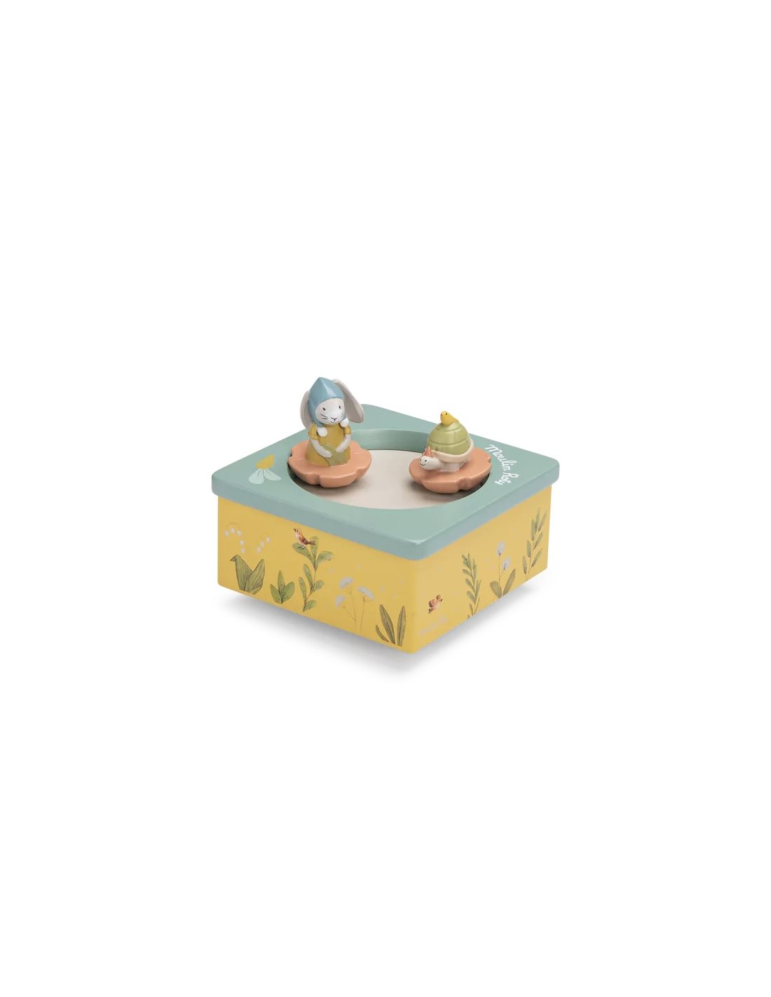 Boîte à musique aux couleurs de la gamme, illustrée d'un joyeux paysage composé de plantes, légumes et petits oiseaux du jardin. Le lapin et la tortue tournent et dansent sur la piste pour bercer et endormir bébé.