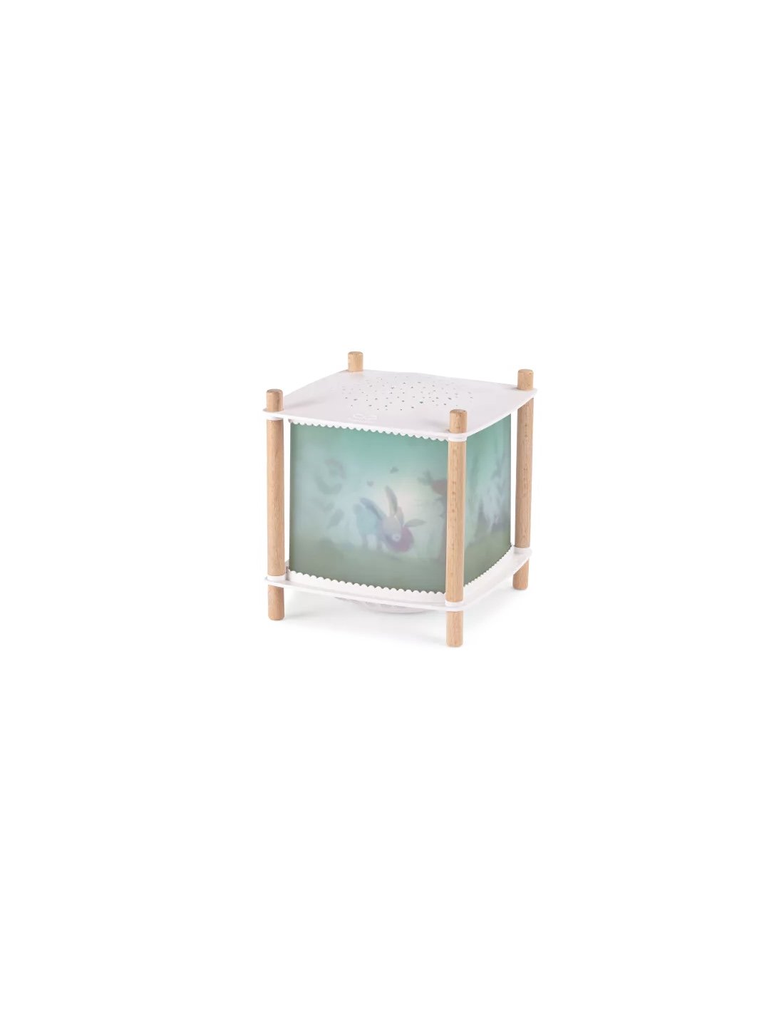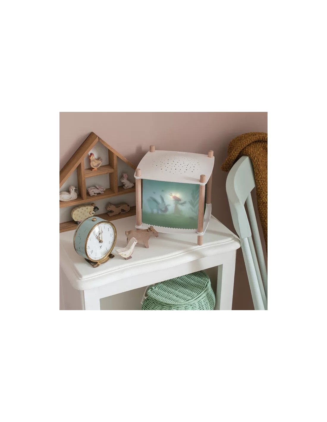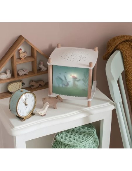 Lanterne magique pour endormir bébé avec les lapins au jardin, comme décor dans la chambre. Multifonction, elle projette des étoiles, joue 4 berceuses, se connecte à distance et détecte même les pleurs ! Câble USB inclus.