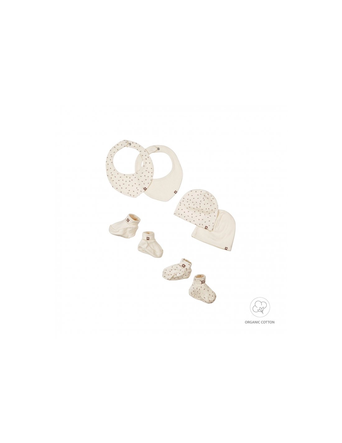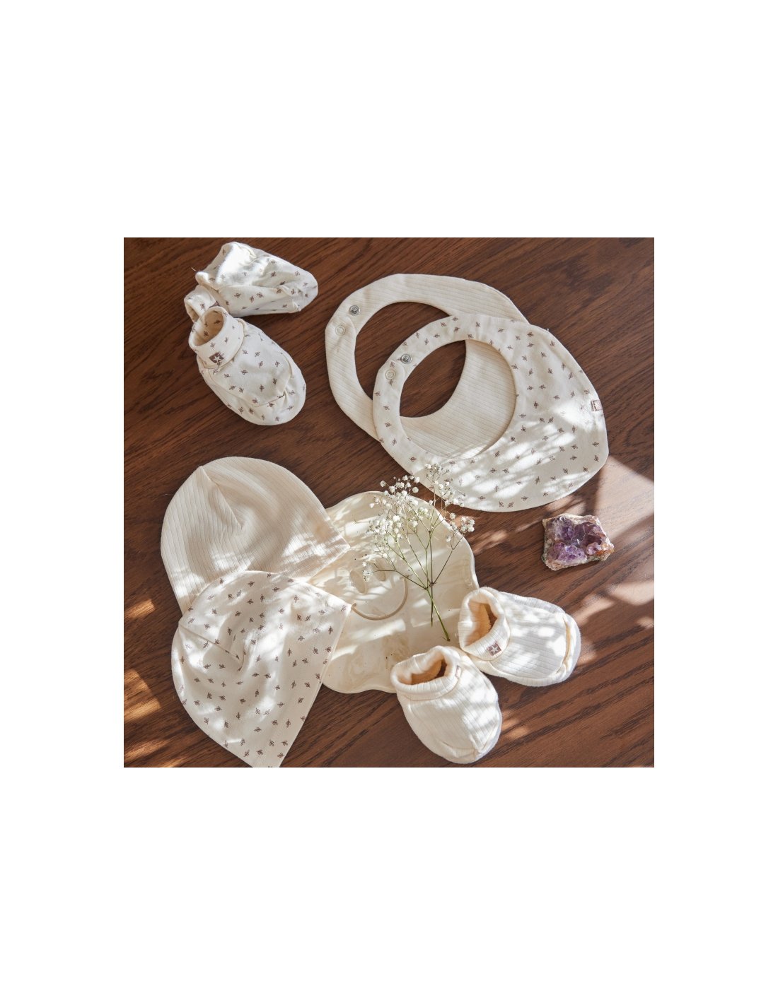 Ensemble bébé comprenant : 2 bavoirs, 2 bonnets naissance et 2 paires de chaussons pour nouveaux nées.
