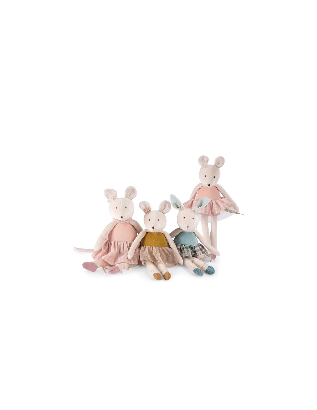 Petite souris en velours au doux visage brodé ! Joues poudrées, jupe tutu rayée rose, petit nœud sur la tête et ballerines nouées, elle est d'une grande élégance. Facile à attraper par les petites mains, elle deviendra le compagnon privilégié de bébé.