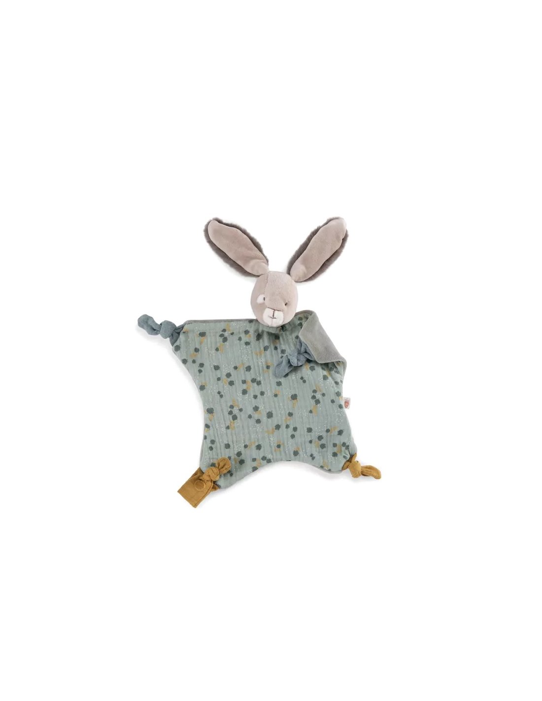 Doudou plat lapin sauge avec attache-tétine. Compagnon bi-matières réconfortant aux grandes oreilles toutes douces, orné de délicats motifs d'un côté. Noué à chaque coin, il est facile à saisir par les petites mains.