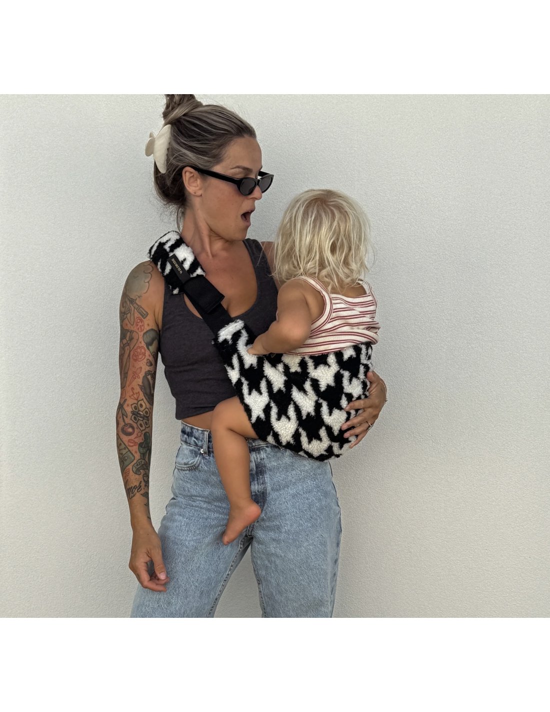 Le porte-bébé a des détails dorés dans les logos.