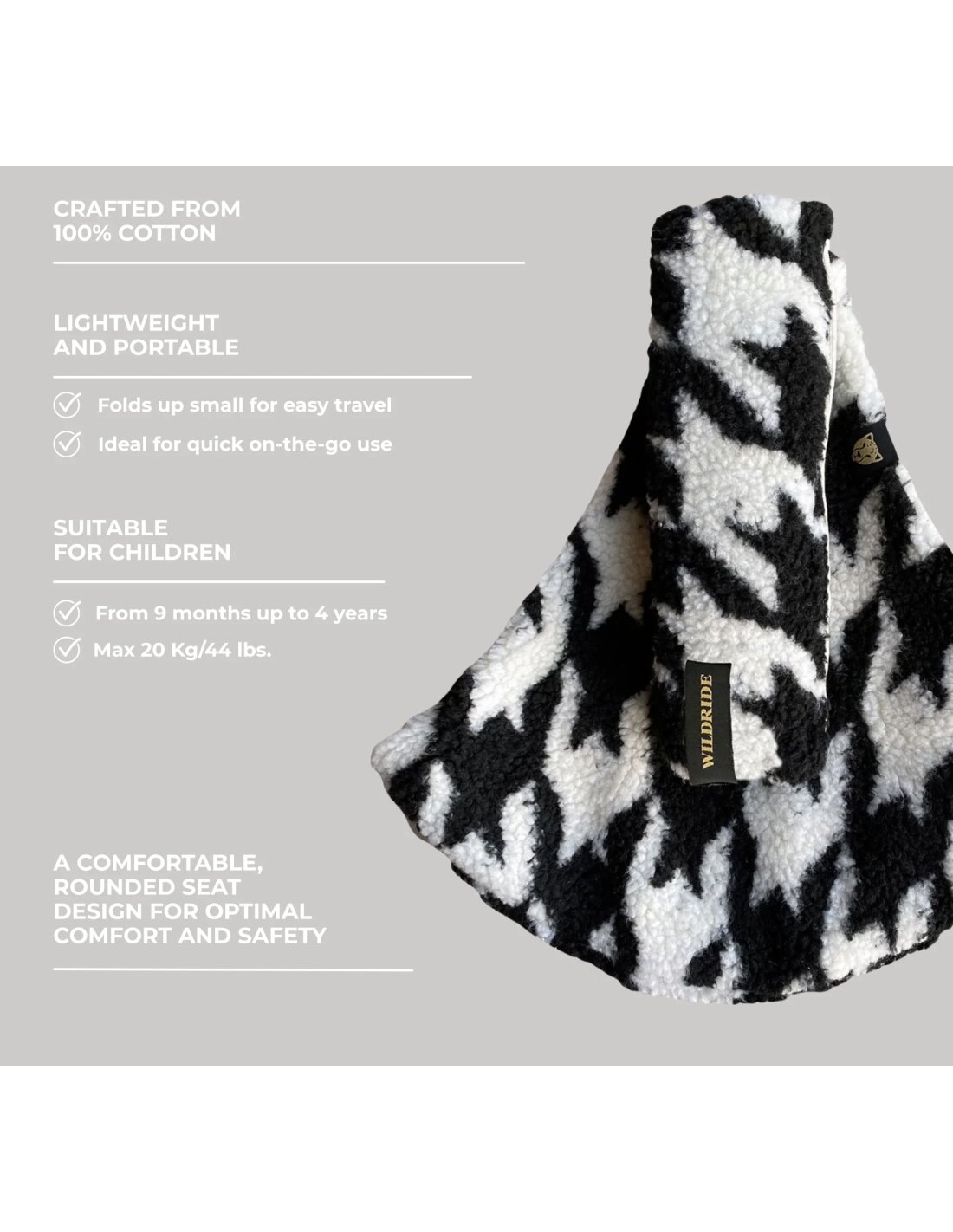 Le porté bébé Wildride, d'un aide très précieuse au portage à bras, est destiné aux enfants de 9 mois à 4 ans (maximum 20 kg).