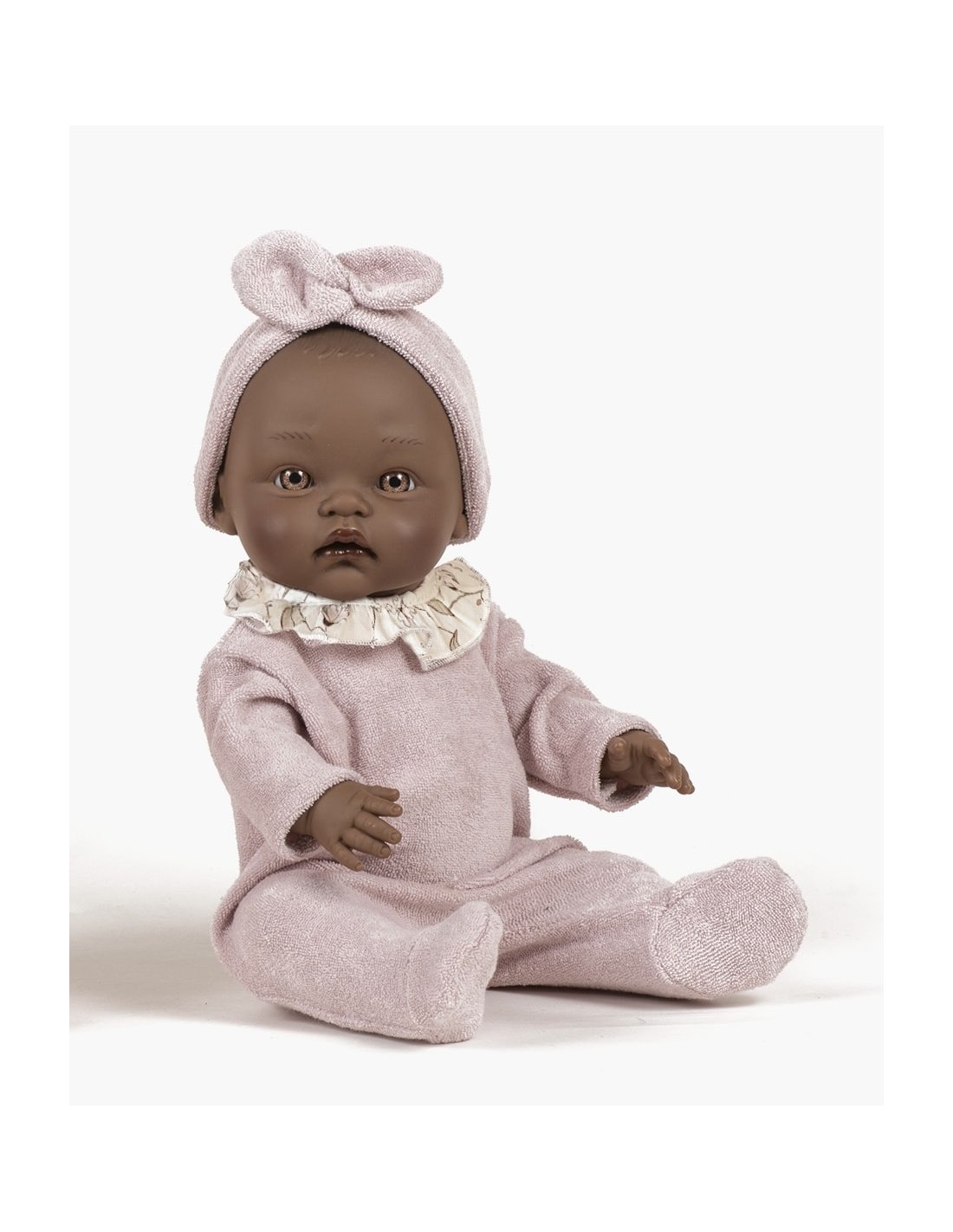 Betty, poupée asexuée Minikane 36cm aux yeux marron. Betty est habillée avec son Dors bien avec collerette et son headband en molleton éponge.