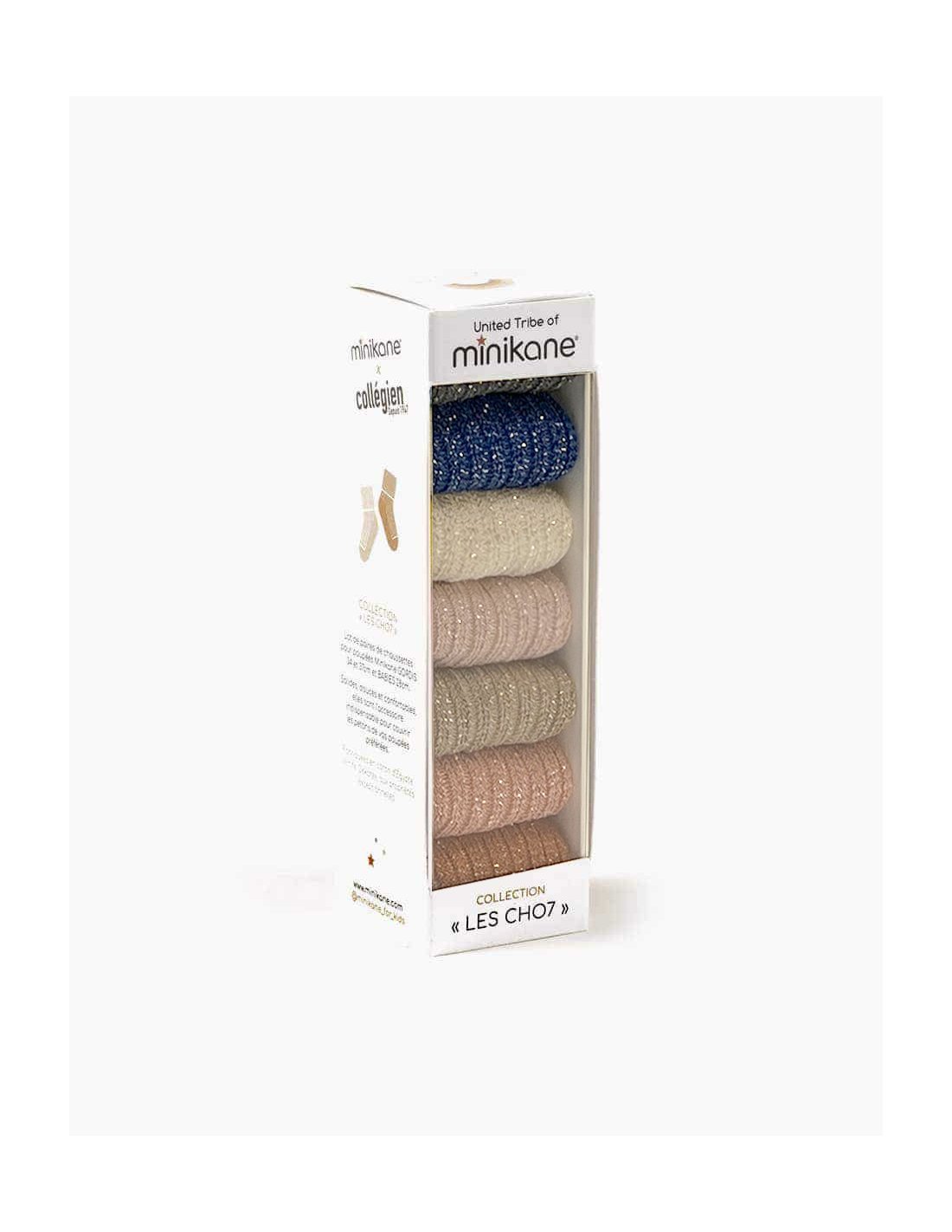 Découvrez le semainier “Cap d’Antibes”, un lot de 7 paires de chaussettes en coton lurex pour poupées Minikane Gordis 34/37cm, Bambinis 47cm et Babies 28cm.