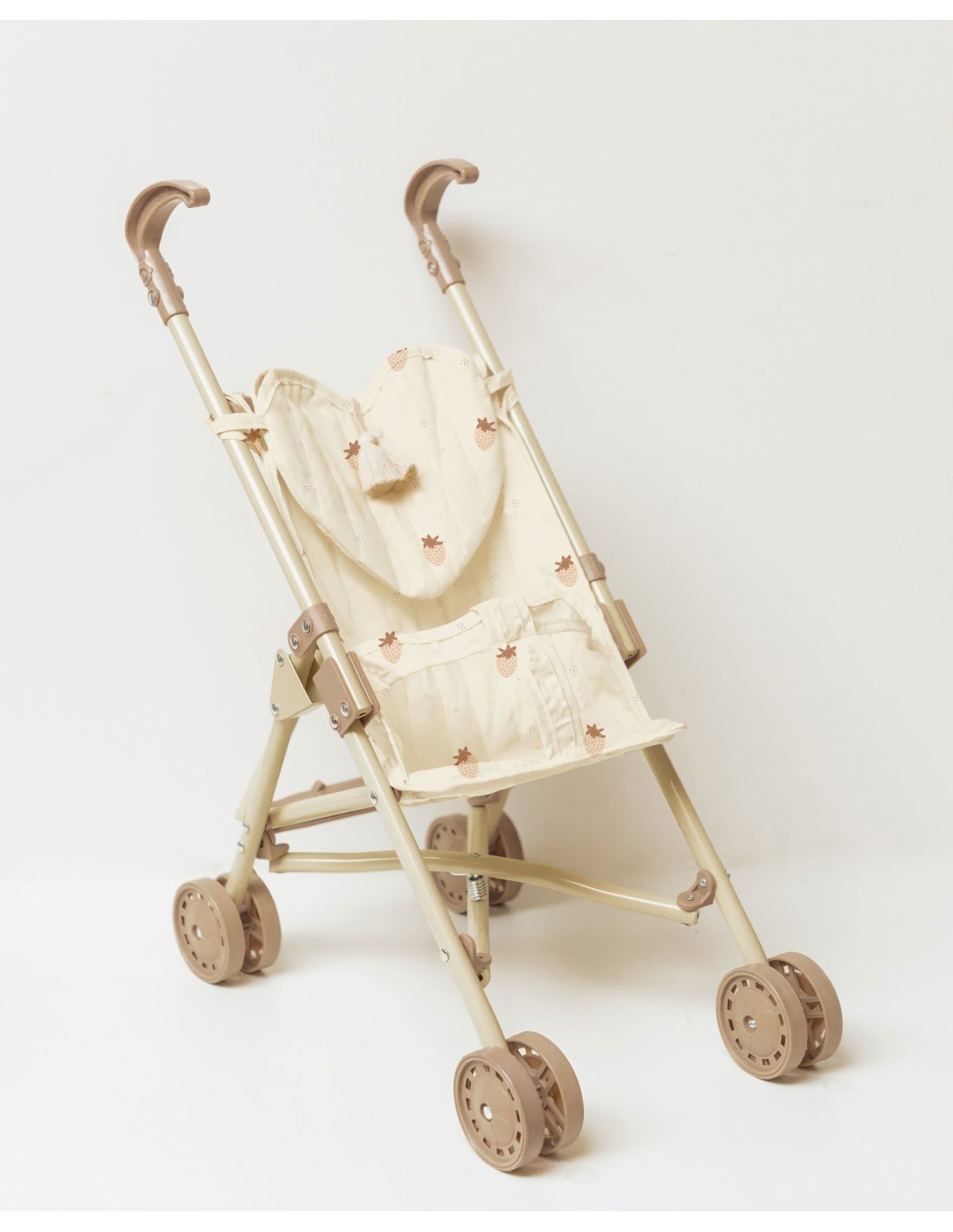 Poussette en métal de chez Mrs Ertha avec un tissu aux jolis imprimés en gaze de coton biologique et amovible.