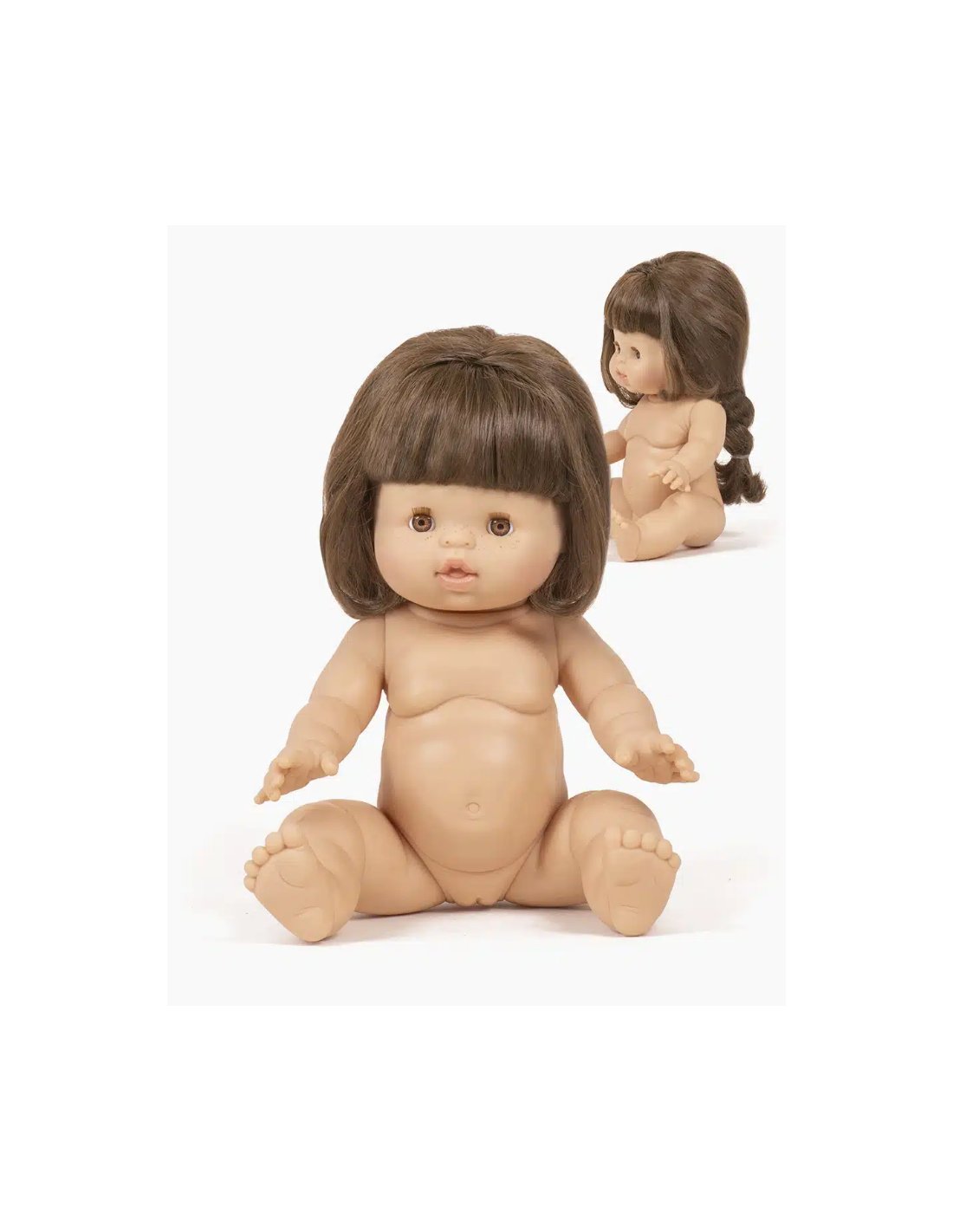 Poupée en vinyle à cheveux avec frange et couettes, parfumée à la vanille.