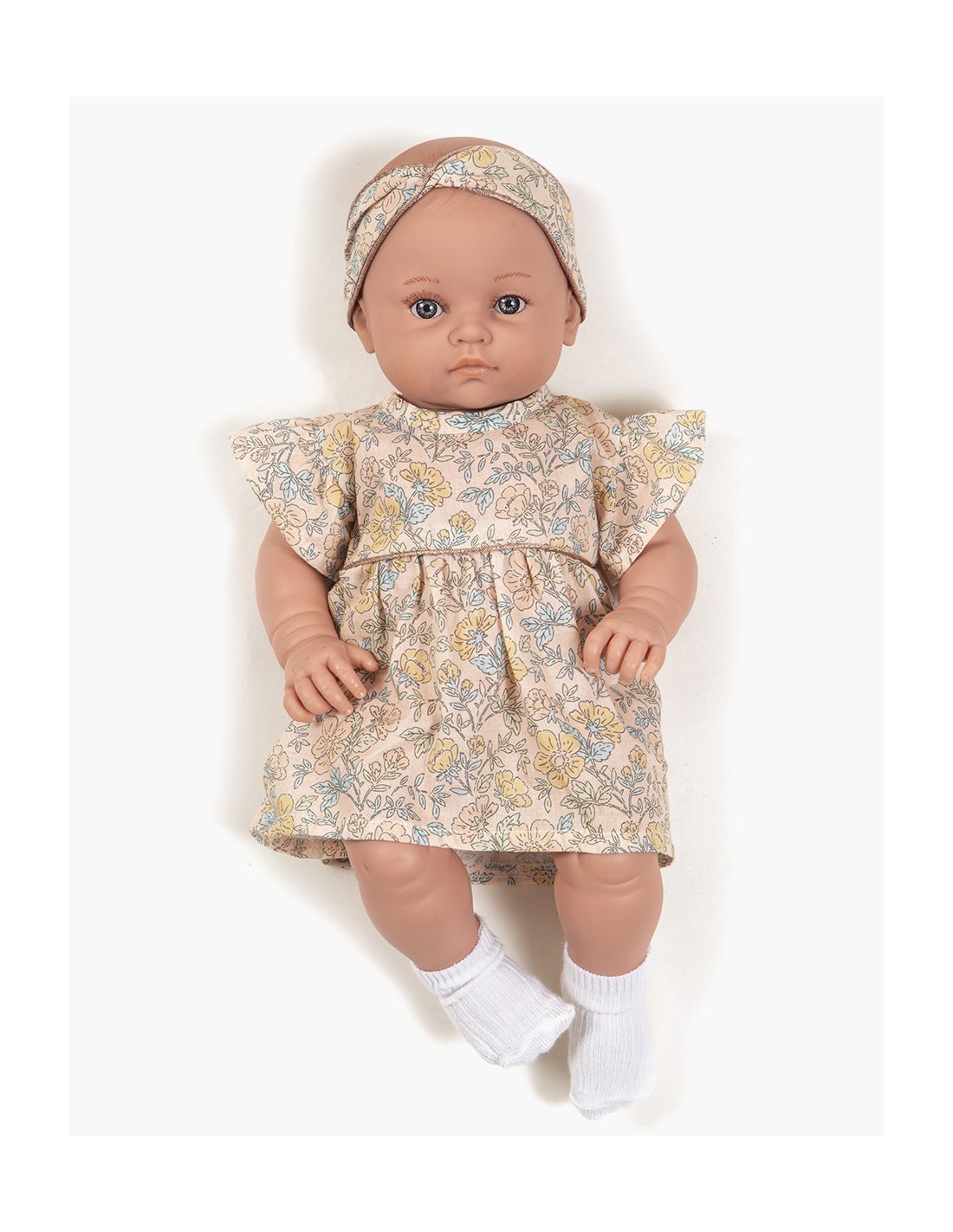 Robe Daisy et son headband croisé en coton avec passepoil lurex pour poupées Minikane Bambinis 47cm.