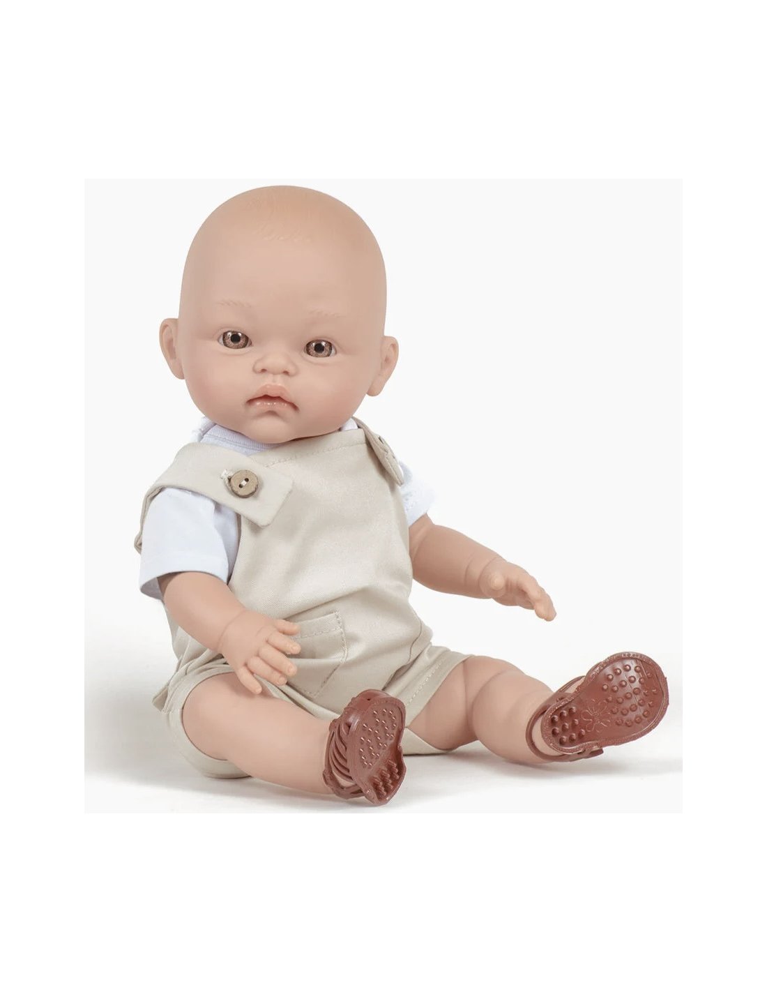 Ensemble salopette Antonin en gabardine beige et t-shirt en jersey blanc pour poupées Minikane Cuties 36cm.