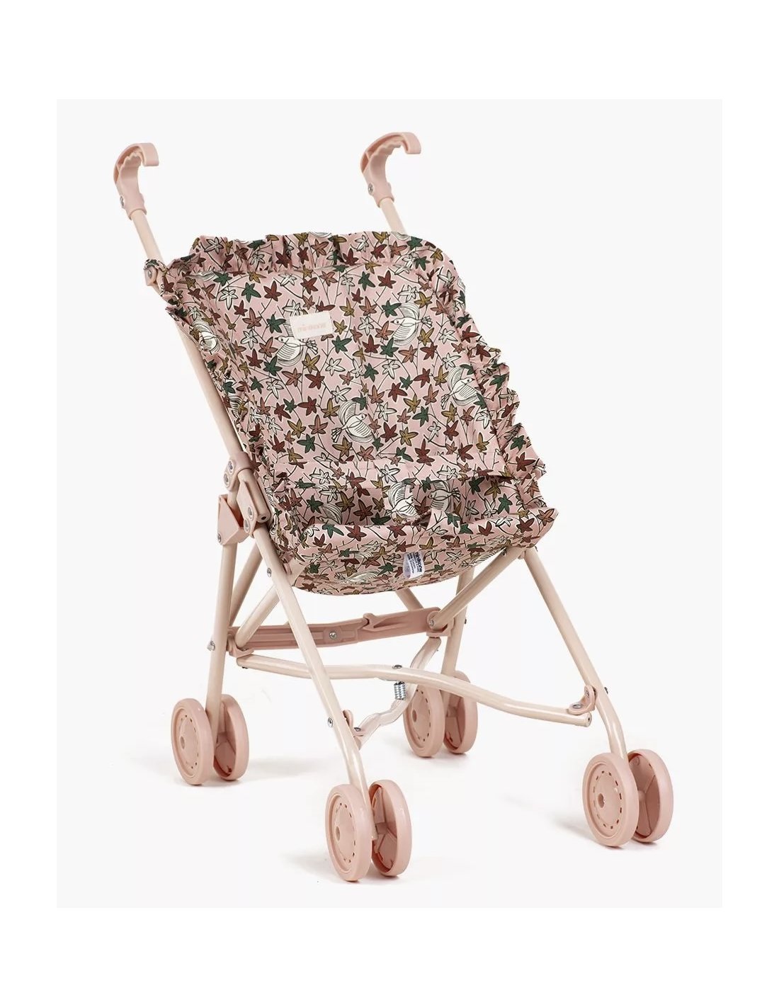 Poussette pliable pour poupée avec assise en coton matelassée à volants.