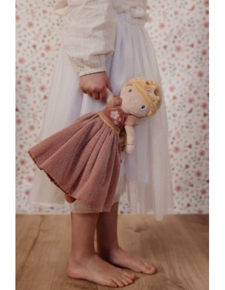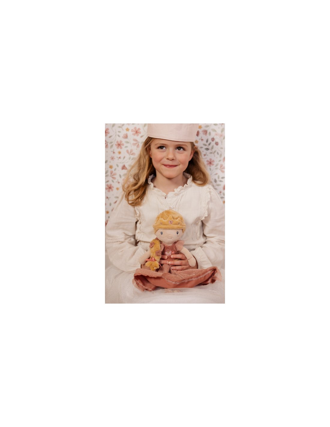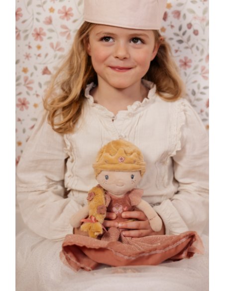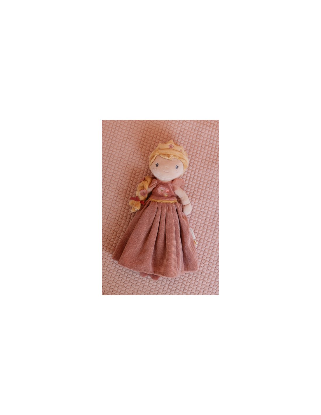 Voici la princesse Julia, une peluche toute douce au charme magique ! Sa tresse blonde, ses fleurs et sa robe de princesse brodée t’invitent aux câlins et aux jeux imaginatifs. Elle t’accompagnera partout comme une adorable amie de voyage !
