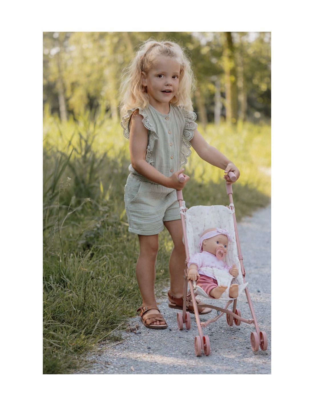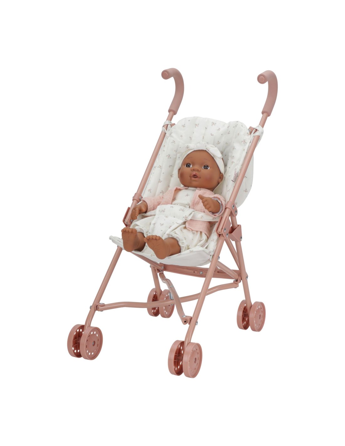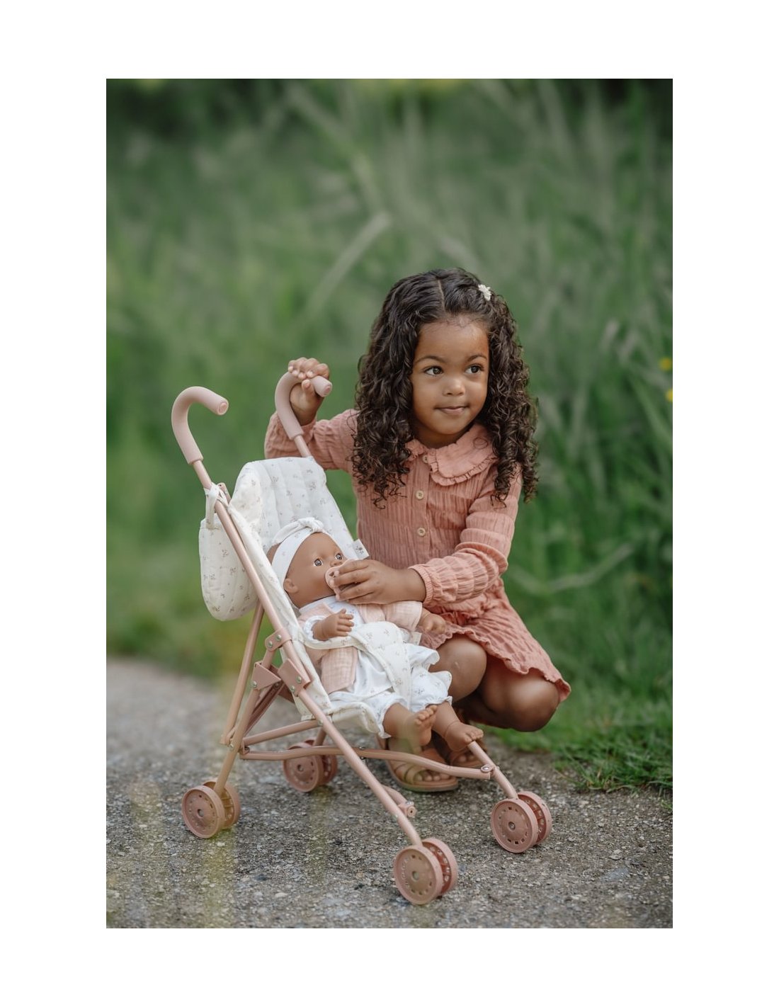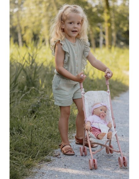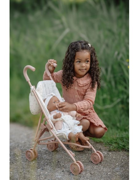 La poussette en métal offre un charme intemporel avec son design élégant et ses finitions délicates, permettant aux enfants de promener leurs poupées avec style.
