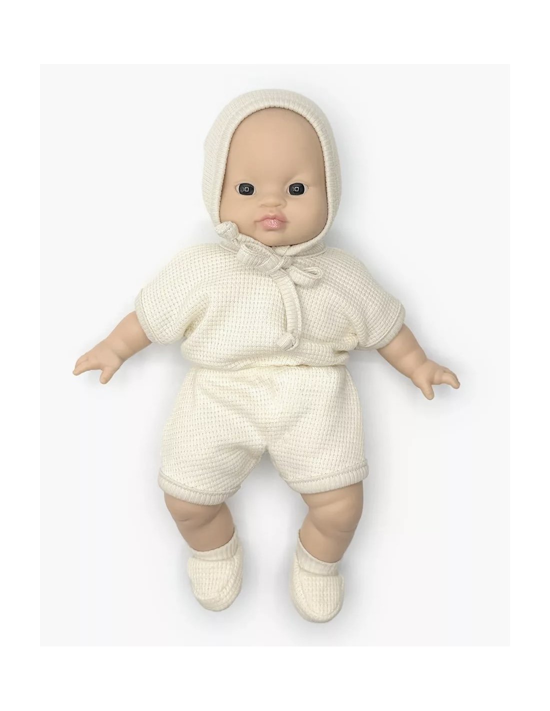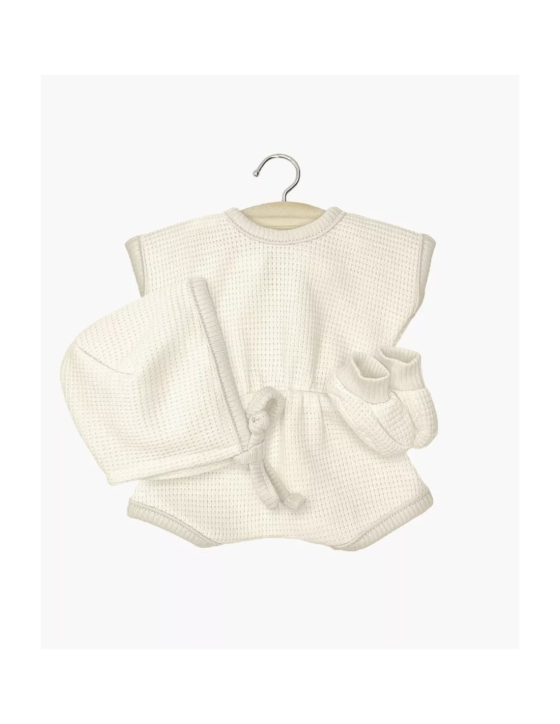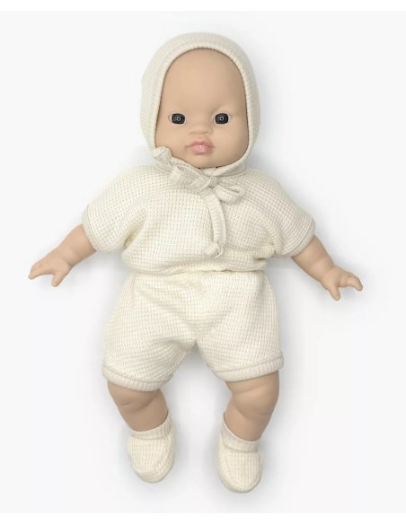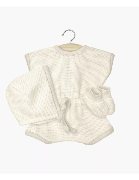 Combinaison Inès en nid d’abeille avec béguin et chaussons pour poupées et poupons Minikane Babies 28cm.