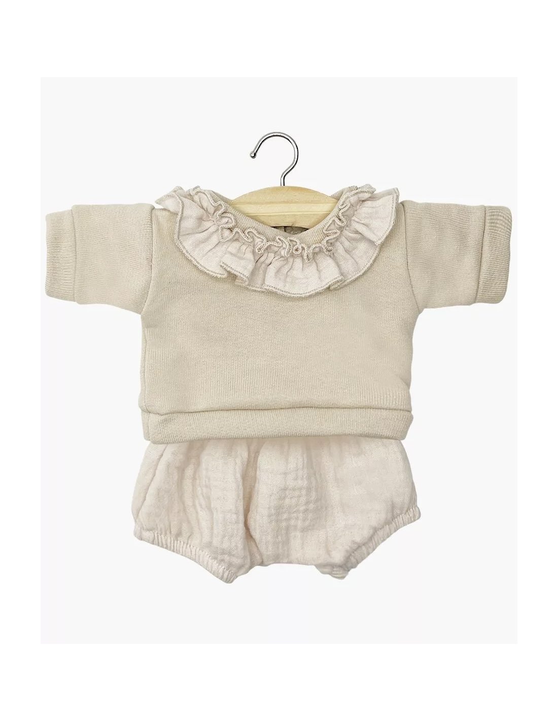 Ensemble Marion avec top à collerette en molleton et bloomer en gaze de coton pour poupées Minikane Babies 28cm.