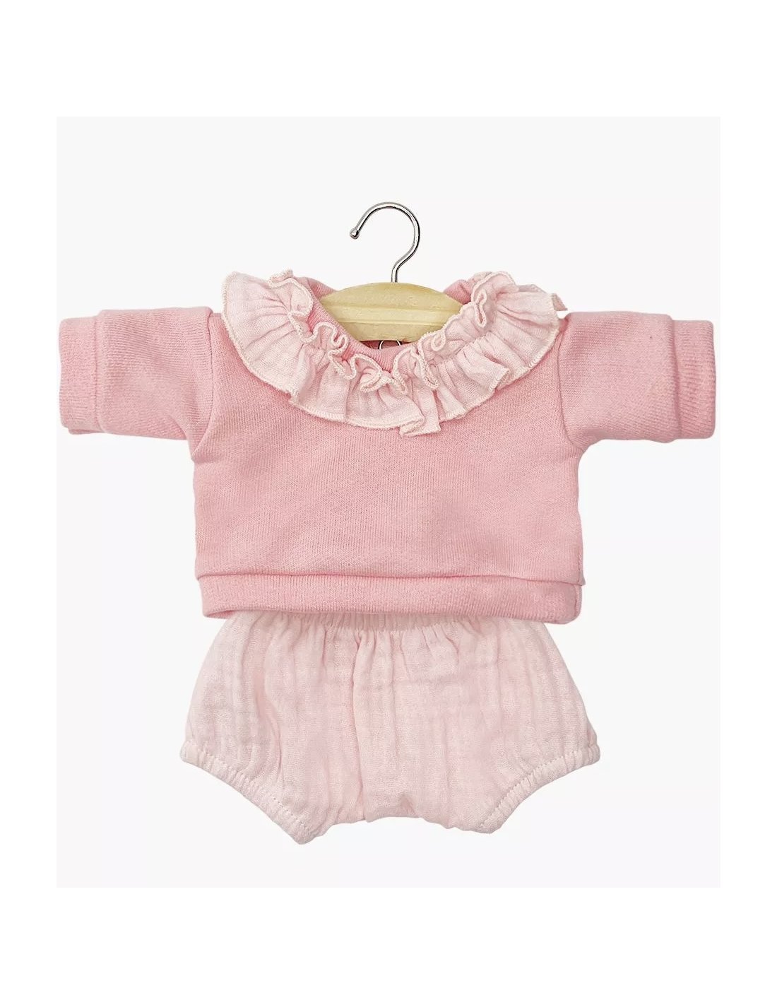 Ensemble Marion avec top à collerette en molleton et bloomer en gaze de coton pour poupées Minikane Babies 28cm.