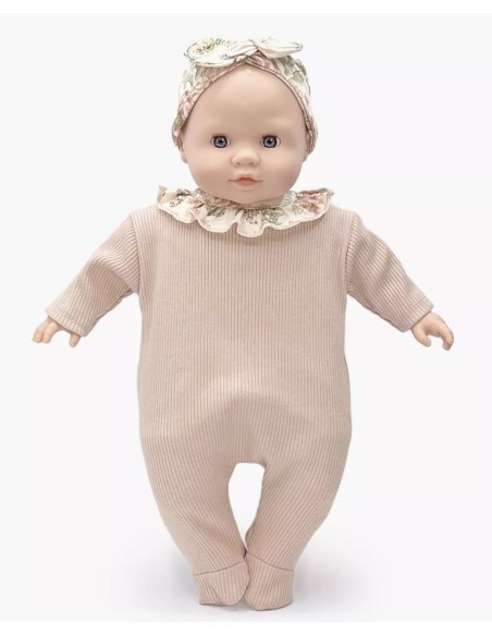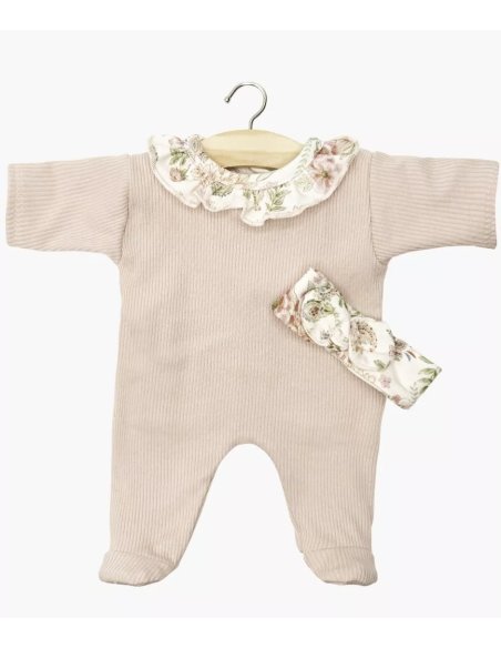 Dors bien Camille en maille côtelée avec collerette et son headband à noeud rond pour poupées Minikane Cuties 36cm.