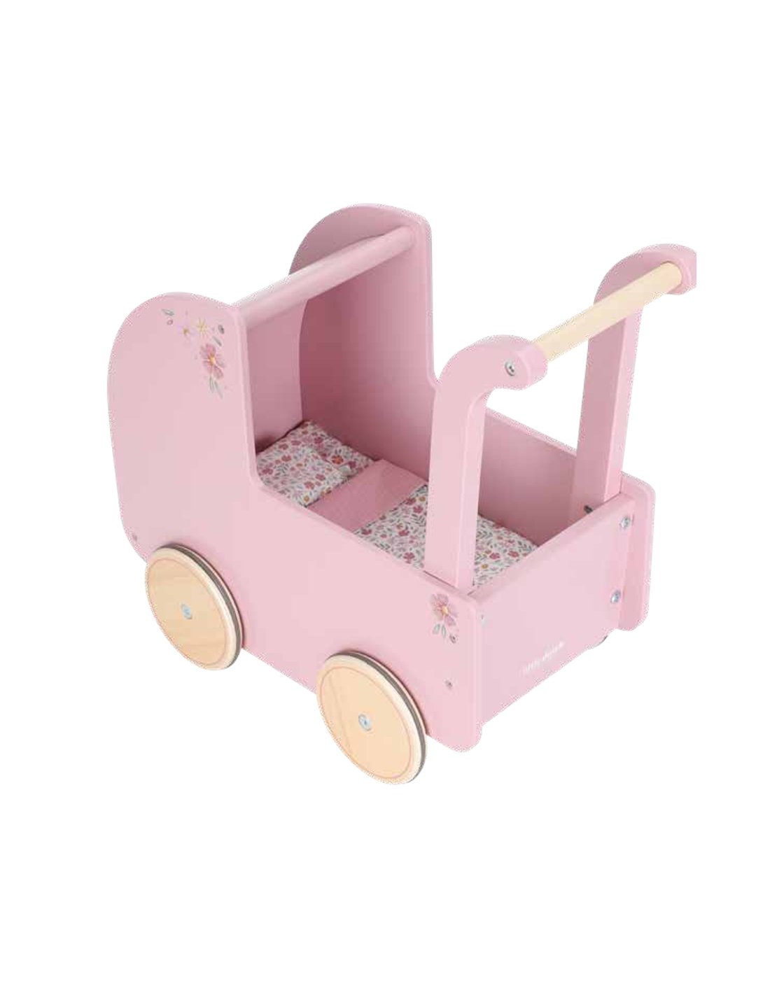 Partons en promenade ! Ce landau en bois permet d’emmener une poupée ou une peluche préférée pour une balade imaginaire. Installez la poupée dans la couverture et laissez place à l’imagination, que ce soit pour faire du shopping ou rendre visite à un ami autour d’une tasse de thé. Ce landau au style rétro est fabriqué en bois robuste et décoré d’un joli motif soft flowers sur le coussin, la couverture et le drap-housse, en faisant également un bel objet décoratif pour la chambre. Voir un enfant pousser ce chariot rempli de poupées et peluches émerveillera tous les regards. Les roues, équipées de bandes en caoutchouc, protègent les sols pendant les jeux. À associer avec la poupée Anna, qui porte une jupe assortie au motif.