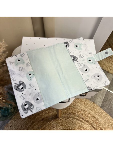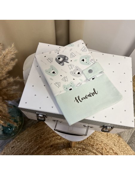 Protège carnet de santé personnalisé, idéal pour un cadeau de naissance. Coloris vert mint, imprimé ours.