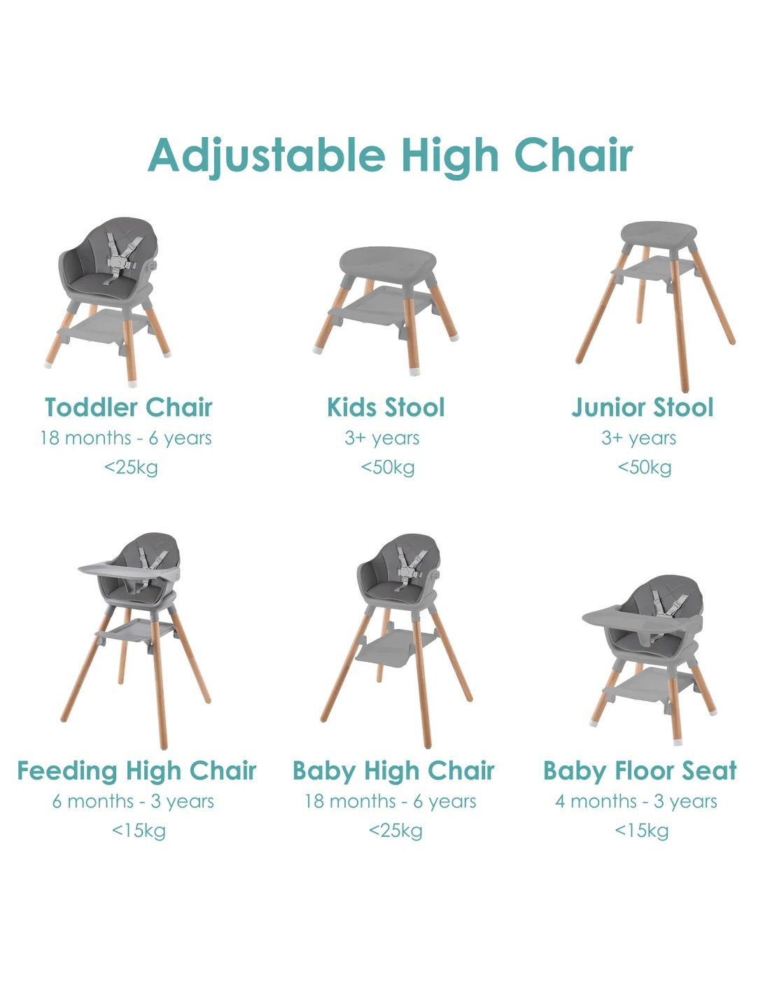 Dotée de six fonctions adaptables, cette chaise haute est un investissement dans le confort de votre enfant et votre tranquillité d'esprit. De 4 mois à 6 ans, elle s'adapte en toute transparence aux différentes étapes de la croissance de votre enfant, garantissant une utilité maximale tout au long de ses étapes de développement.