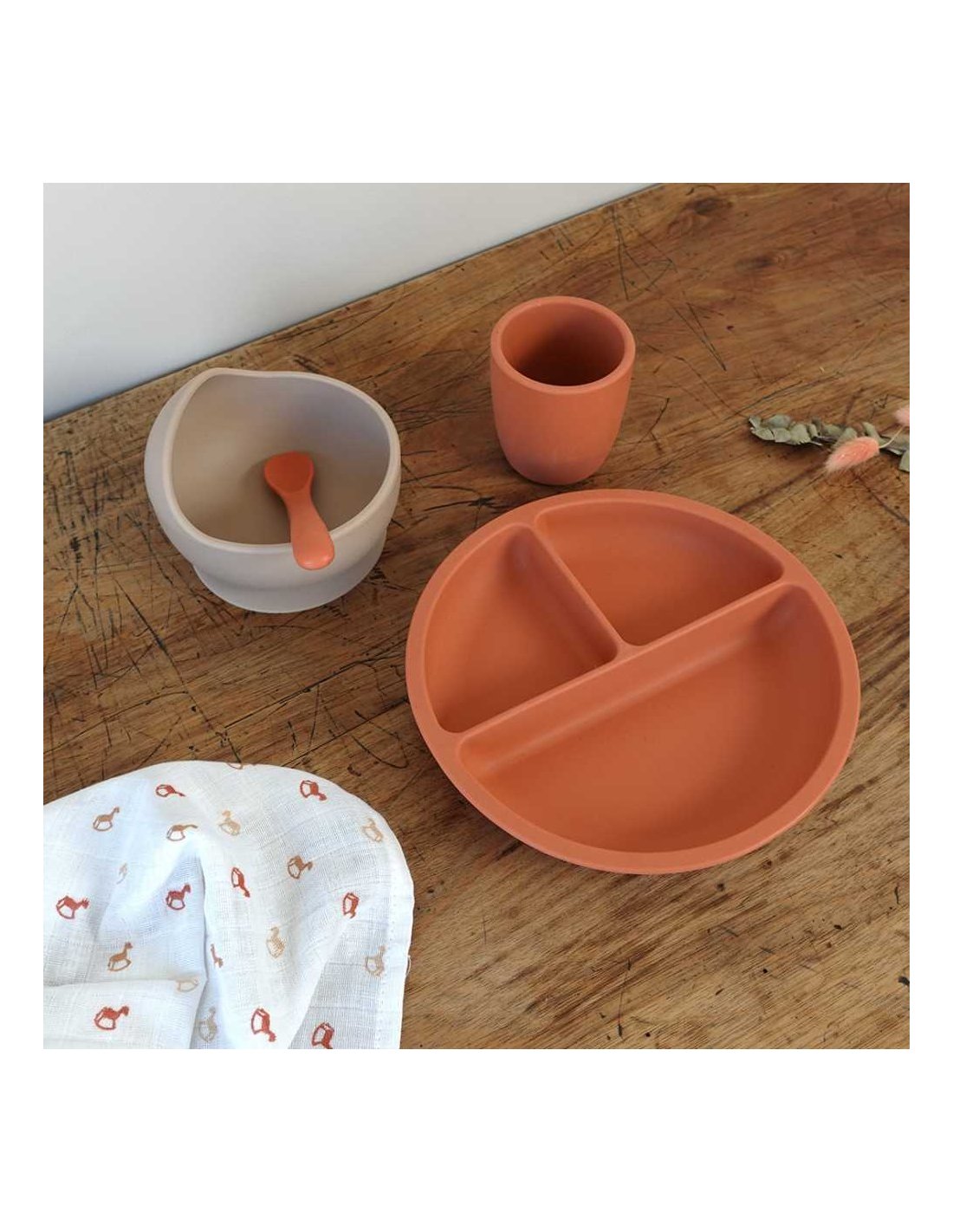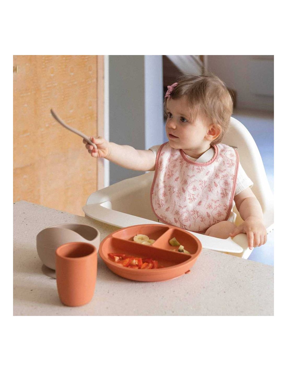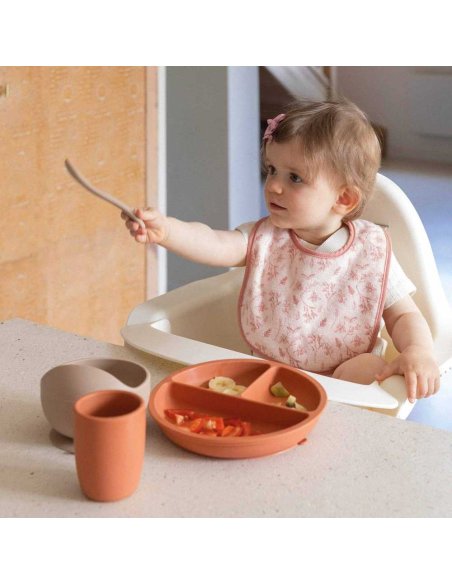 Côté entretien, tout est pensé pour vous simplifier la vie : le set passe au lave-vaisselle, mais peut aussi être lavé à la main rapidement. Les coloris sable et terracotta en font un produit au design élégant et moderne, qui s’intègre parfaitement dans l’univers du repas de bébé.