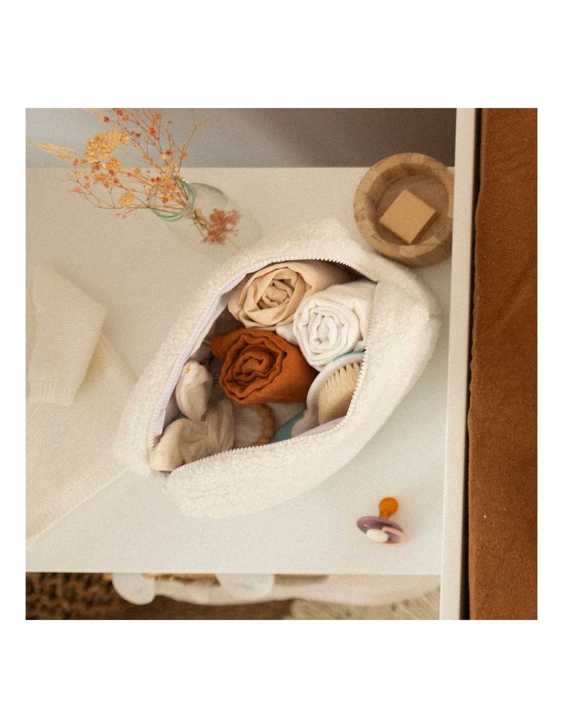 Essentiel au quotidien, le vanity bébé va vous permettre de ranger efficacement ses affaires. Vous pourrez facilement y placer un lange, une brosse et tous le nécessaire de toilette de bébé. Elle se ferme sur le dessus à l'aide d'une fermeture éclair, ce qui vous permettra de l'emmener de partout avec vous. Sa matière sherpa toute douce est à la mode et s'harmonisera dans toutes les décos de chambre, de plus la totalité de l'intérieur du vanity bébé est recouverte d'un revêtement plastifié, assurant une protection maximale contre d'éventuels déversements de produits. Sa couleur écru mixte en fera un cadeau de naissance idéal.